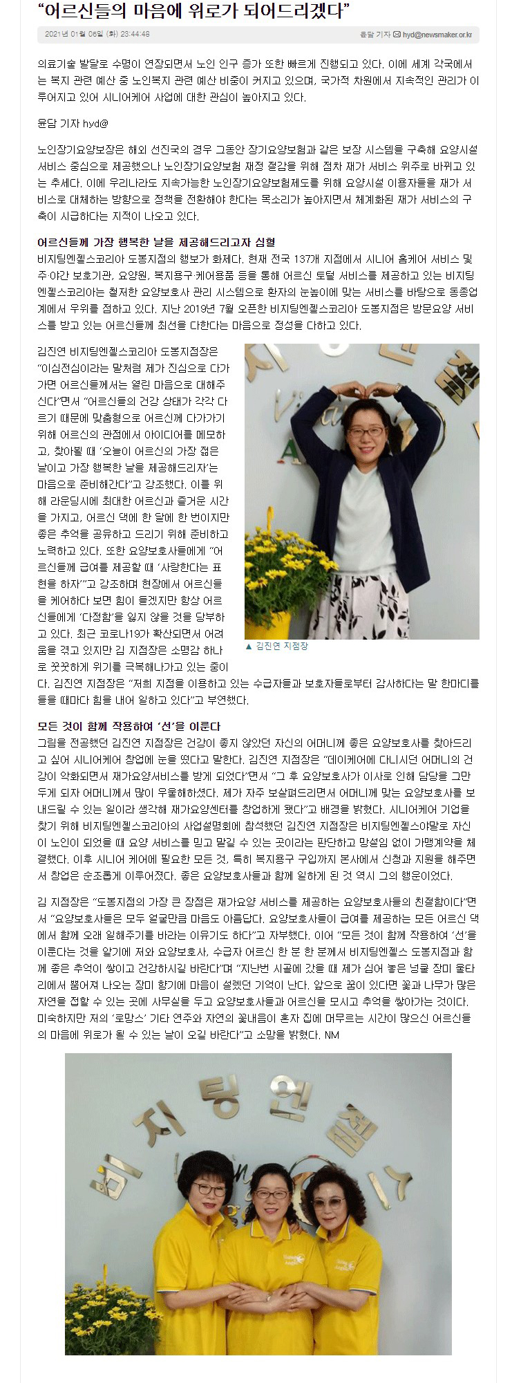 VA소식 미디어 지점 활동 및 소식 채용 채용 신청서 제목[도봉지점] 어르신들의 마음에 위로가 되어드리겠다2021-06-07 17:17작성자비지팅엔젤스 코리아 Information 목록 댓글 [0] 더보기이전[김해지점] 마음까지 케어 할 수 있는 매칭으로 사회복지에 기여하겠습니다.비지팅엔젤스 코리아 Information2021-06-07다음[일산동구] 교회-주야간보호기관으로 이어지는 선작용 통해 선교사역의 새 문을 열다비지팅엔젤스 코리아 Information2021-06-07 Powered by MangBoard | 망보드 스토어