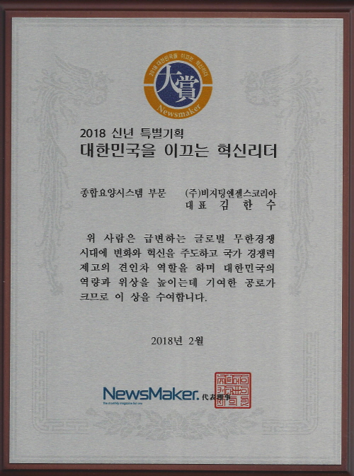 시사종합월간지 뉴스메이커가 선정한 이번 수상은 비지팅엔젤스코리아와 김한수 대표이사가 사회적 책임경영과 혁신경영을 통해 국가와 사회에 기여한 공로를 인정받아 선정되었습니다. 김한수 대표이사는 "이번 수상으로 더 큰 책임감을 갖고 시니케어 케어 분야에 더 많은 혁신을 불러일으키도록 노력하겠습니다." 라고 인터뷰를 통해 수상소감을 밝혔다.