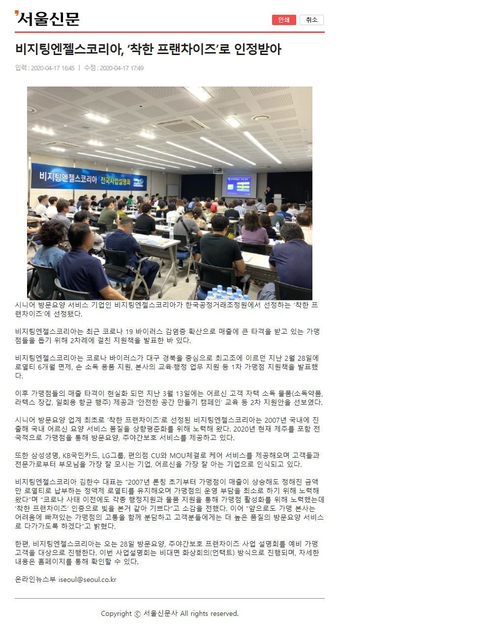 VA소식 미디어 지점 활동 및 소식 채용 채용 신청서 제목업계 유일 착한 프랜차이즈 선정! (한국공정거래조정원 인증)2020-04-27 17:40작성자비지팅엔젤스 코리아 Information (2020/04/17) 목록 댓글 [0] 더보기이전2019년도 국민건강보험공단 장기요양기관 평가 5회 연속 최우수 기관(A등급) 선정!비지팅엔젤스 코리아 Information2020-05-04다음가맹점 고통 분담 위한 2차 지원책 발표비지팅엔젤스 코리아 Information2020-04-03 Powered by MangBoard | 망보드 스토어