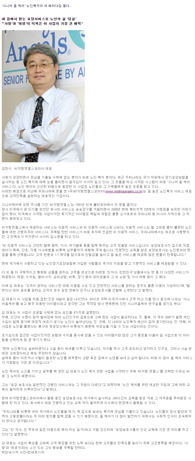 VA소식 미디어 지점 활동 및 소식 채용 채용 신청서 제목[유비즈헤럴드] ‘시니어 홈 케어’ 노인복지의 새 패러다임 열다2020-04-12 17:38카테고리매거진작성자비지팅엔젤스 코리아 Information2009.06.29 목록 댓글 [0] 더보기이전[서울크래딧]트렌드를 읽고 준비한 창업이 은퇴이후 또 다른 삶의 시작(2010년07월호)비지팅엔젤스 코리아 Information2020-04-12다음[월간노인복지]미국본사의 18년 노하우를 그대로 어르신들을 모십니다.(주)비지팅엔젤스코리아(2009년5월호)비지팅엔젤스 코리아 Information2020-04-12 Powered by MangBoard | 망보드 스토어