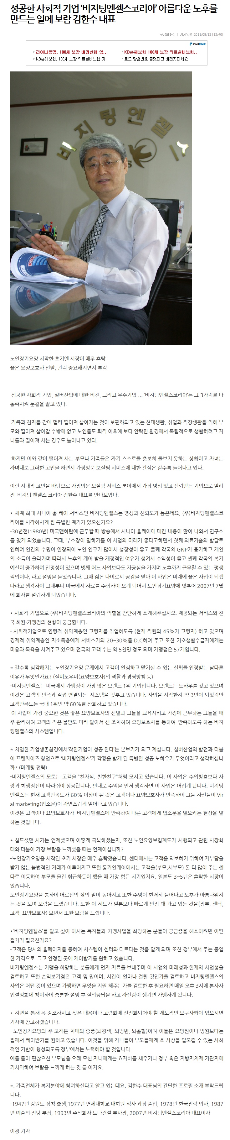 VA소식 미디어 지점 활동 및 소식 채용 채용 신청서 제목[한국NGO뉴스] 성공한 사회적 기업 ‘비지팅엔젤스코리아’ 아름다운 노후를 만드는 일에 보람2020-04-12 17:41카테고리매거진작성자비지팅엔젤스 코리아 Information2011.08.12 목록 댓글 [0] 더보기이전[피플투데이]실버산업의 새 지평을 열다(2012년10월호)비지팅엔젤스 코리아 Information2020-04-13다음[서울크래딧]트렌드를 읽고 준비한 창업이 은퇴이후 또 다른 삶의 시작(2010년07월호)비지팅엔젤스 코리아 Information2020-04-12 Powered by MangBoard | 망보드 스토어