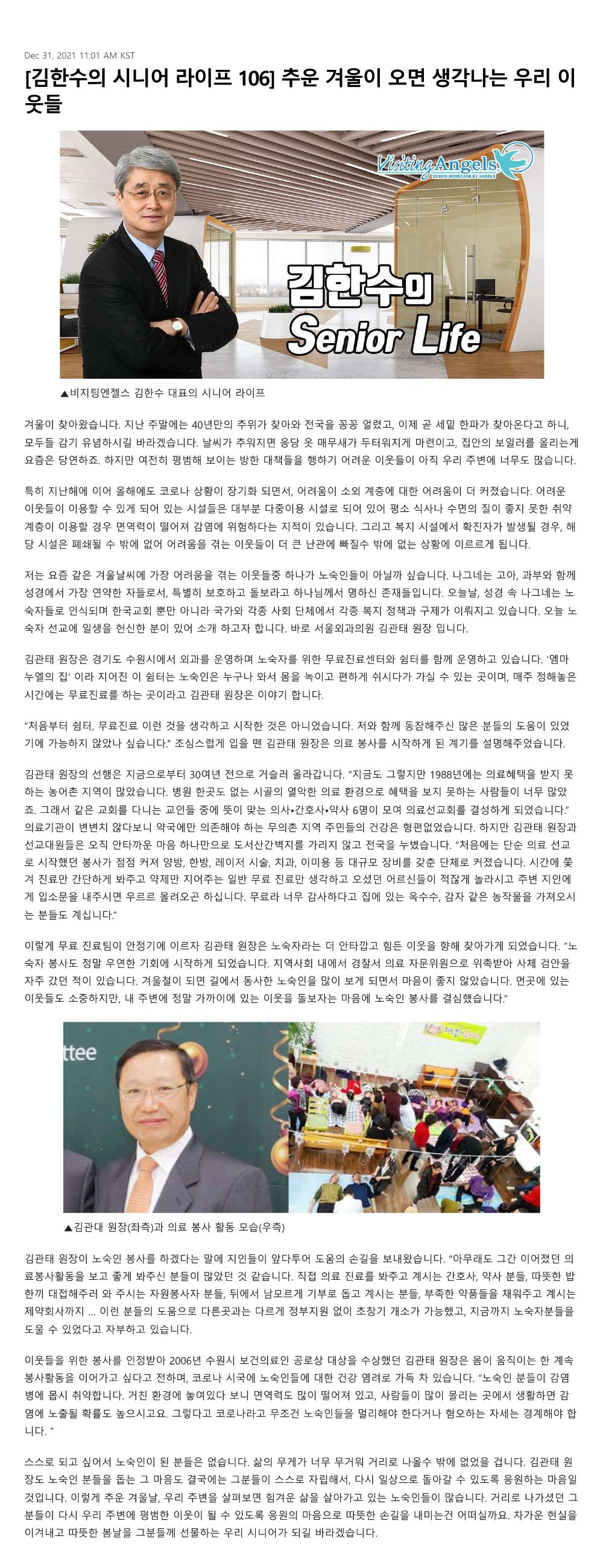 VA소식 미디어 지점 활동 및 소식 채용 채용 신청서 제목[크리스천 투데이 칼럼 106] 추운 겨울이 오면 생각나는 우리 이웃들2022-02-11 15:05카테고리칼럼작성자비지팅엔젤스 코리아 Information 목록 댓글 [0] 더보기이전[크리스천 투데이 칼럼 107] 말로는 다 전달하지 못하는 마음, 진심비지팅엔젤스 코리아 Information2022-02-11다음[크리스천 투데이 칼럼 105] 사람이 미래다비지팅엔젤스 코리아 Information2021-11-30 Powered by MangBoard | 망보드 스토어