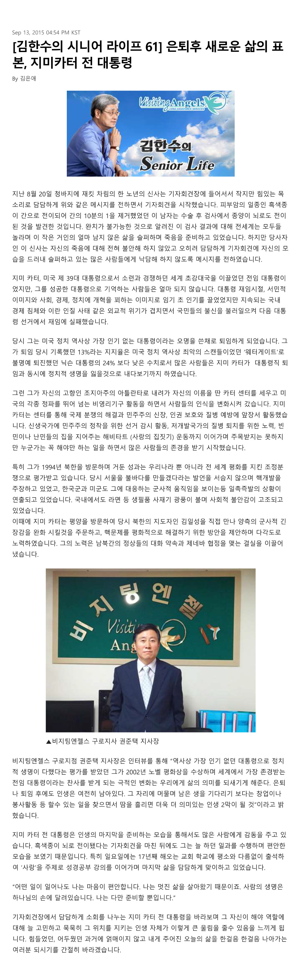 VA소식 미디어 지점 활동 및 소식 채용 채용 신청서 제목[크리스천 투데이 칼럼 61] 은퇴 후 새로운 삶의 표본, 지미카터 전 대통령2021-08-11 15:10카테고리칼럼작성자비지팅엔젤스 코리아 Information 목록 댓글 [0] 더보기이전[크리스천 투데이 칼럼 62] 6복에 대해 아시나요?비지팅엔젤스 코리아 Information2021-08-11다음[크리스천 투데이 칼럼 59] 신기한 24절기와 우리 생활비지팅엔젤스 코리아 Information2021-08-11 Powered by MangBoard | 망보드 스토어