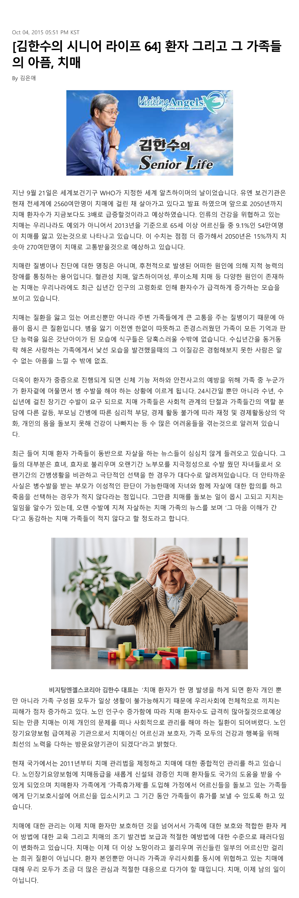 VA소식 미디어 지점 활동 및 소식 채용 채용 신청서 제목[크리스천 투데이 칼럼 64] 환자 그리고 그 가족들의 아픔, 치매2021-08-11 15:51카테고리칼럼작성자비지팅엔젤스 코리아 Information 목록 댓글 [0] 더보기이전[크리스천 투데이 칼럼 65] 시니어가 한글을 깨우친다는 것비지팅엔젤스 코리아 Information2021-08-11다음[크리스천 투데이 칼럼 63] '노인' 이라는 명칭에 대하여비지팅엔젤스 코리아 Information2021-08-11 Powered by MangBoard | 망보드 스토어