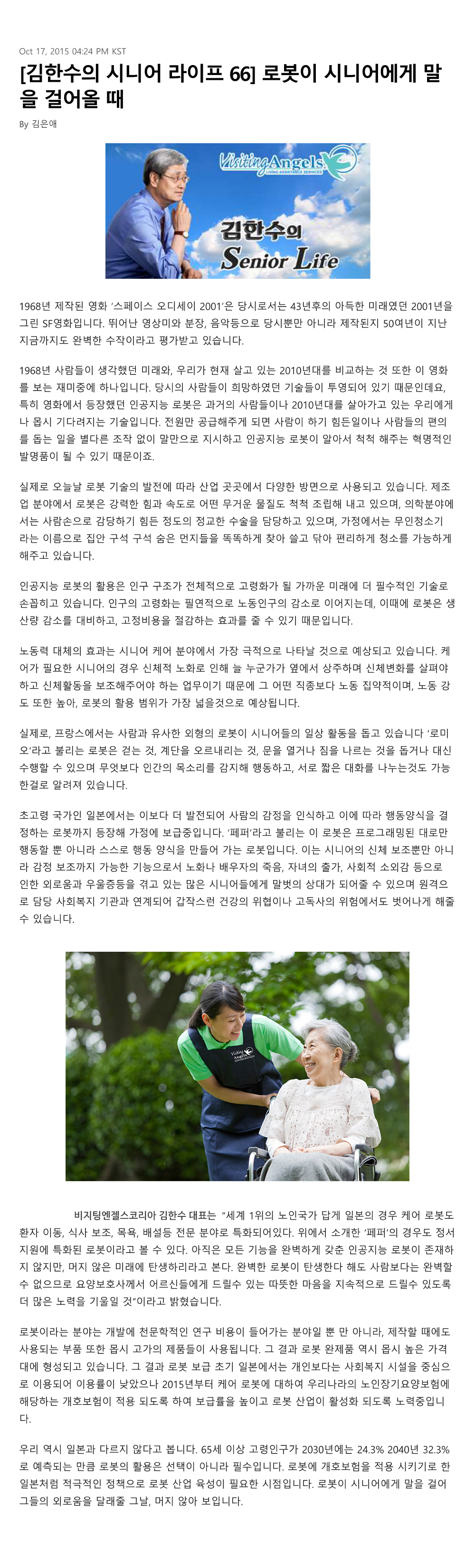 VA소식 미디어 지점 활동 및 소식 채용 채용 신청서 제목[크리스천 투데이 칼럼 66] 로봇이 시니어에게 말을 걸어올 때2021-08-11 16:02카테고리칼럼작성자비지팅엔젤스 코리아 Information 목록 댓글 [0] 더보기이전[크리스천 투데이 칼럼 67] 경험은 늙지 않는다비지팅엔젤스 코리아 Information2021-08-11다음[크리스천 투데이 칼럼 65] 시니어가 한글을 깨우친다는 것비지팅엔젤스 코리아 Information2021-08-11 Powered by MangBoard | 망보드 스토어