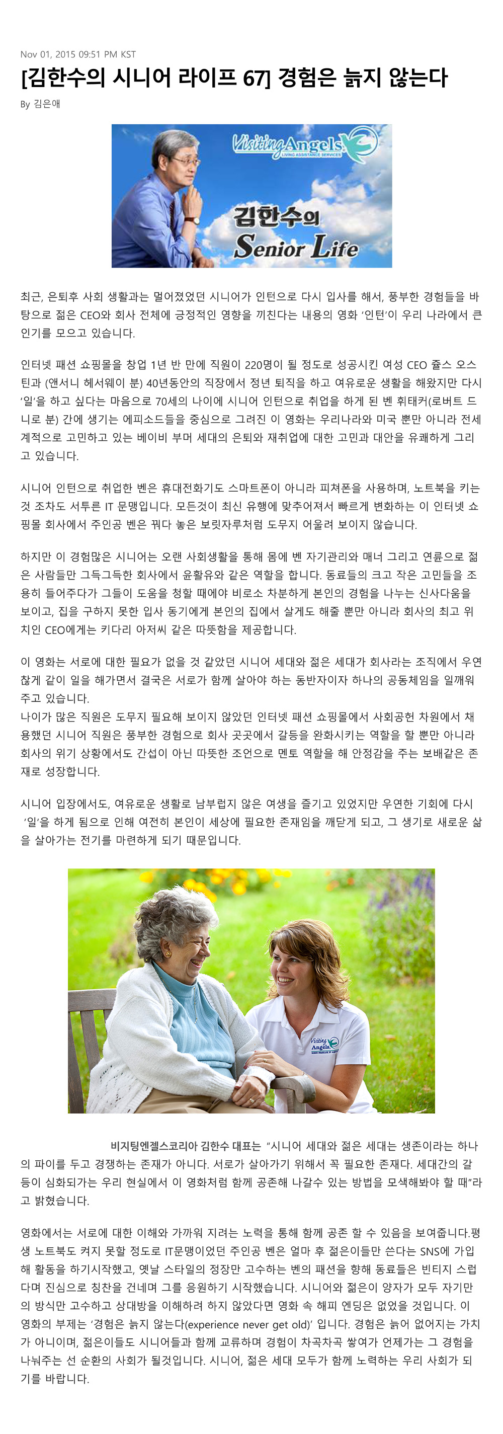 VA소식 미디어 지점 활동 및 소식 채용 채용 신청서 제목[크리스천 투데이 칼럼 67] 경험은 늙지 않는다2021-08-11 16:03카테고리칼럼작성자비지팅엔젤스 코리아 Information 목록 댓글 [0] 더보기이전[크리스천 투데이 칼럼 68] 이산가족의 아픔비지팅엔젤스 코리아 Information2021-08-11다음[크리스천 투데이 칼럼 66] 로봇이 시니어에게 말을 걸어올 때비지팅엔젤스 코리아 Information2021-08-11 Powered by MangBoard | 망보드 스토어