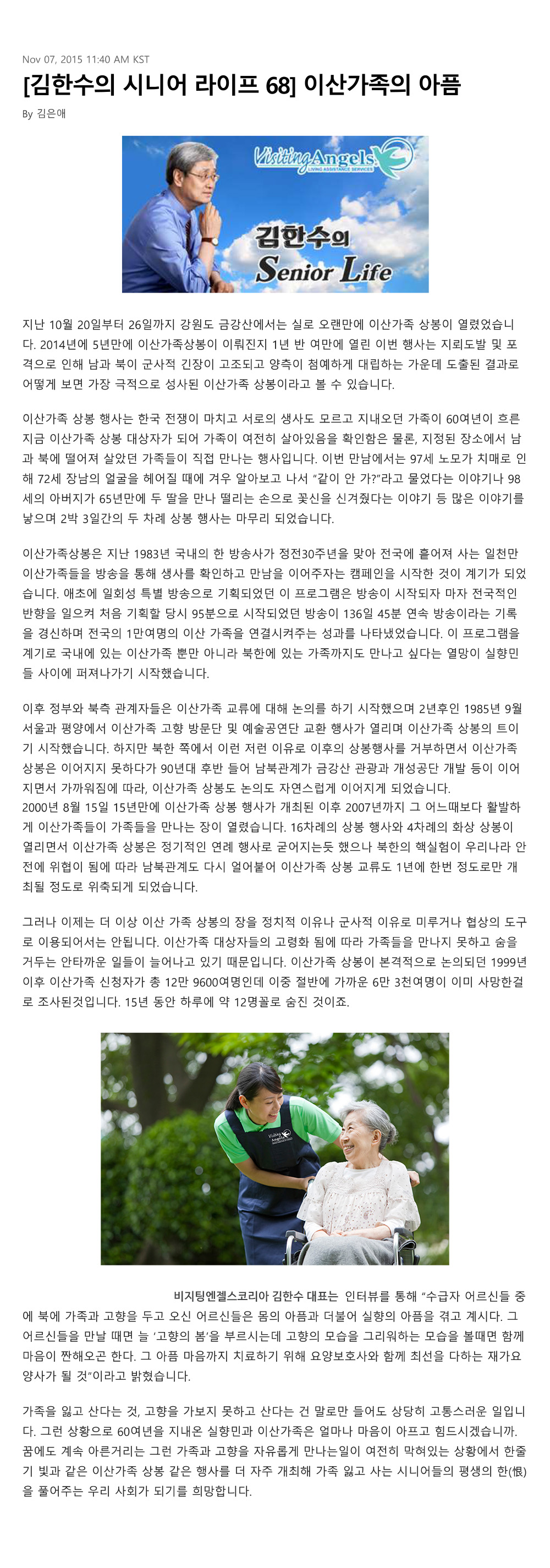 VA소식 미디어 지점 활동 및 소식 채용 채용 신청서 제목[크리스천 투데이 칼럼 68] 이산가족의 아픔2021-08-11 16:04카테고리칼럼작성자비지팅엔젤스 코리아 Information 목록 댓글 [0] 더보기이전[크리스천 투데이 칼럼 69] 여행을 떠나요비지팅엔젤스 코리아 Information2021-08-11다음[크리스천 투데이 칼럼 67] 경험은 늙지 않는다비지팅엔젤스 코리아 Information2021-08-11 Powered by MangBoard | 망보드 스토어