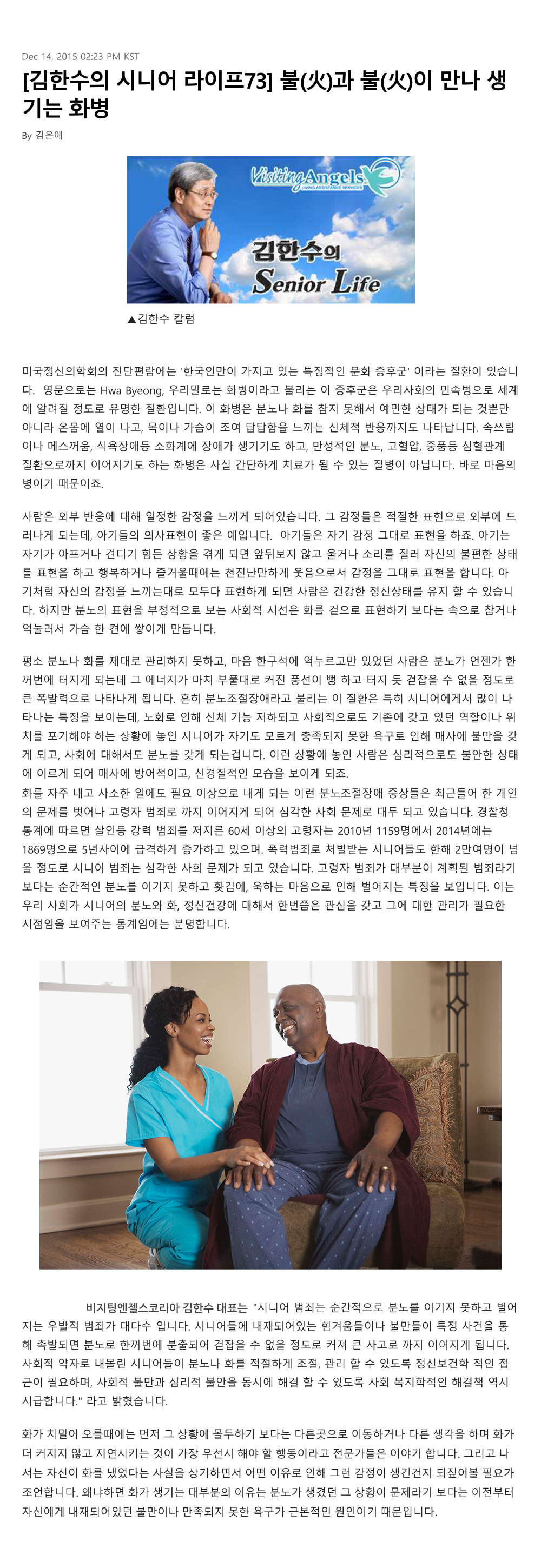 VA소식 미디어 지점 활동 및 소식 채용 채용 신청서 제목[크리스천 투데이 칼럼 73] 불(火)과 불(火)이 만나 생기는 화병2021-08-11 16:08카테고리칼럼작성자비지팅엔젤스 코리아 Information 목록 댓글 [0] 더보기이전[크리스천 투데이 칼럼 74] 보온과 체온 유지에 달린 시니어의 겨울 건강비지팅엔젤스 코리아 Information2021-08-11다음[크리스천 투데이 칼럼 72] 시니어도 '독립'을 원한다비지팅엔젤스 코리아 Information2021-08-11 Powered by MangBoard | 망보드 스토어