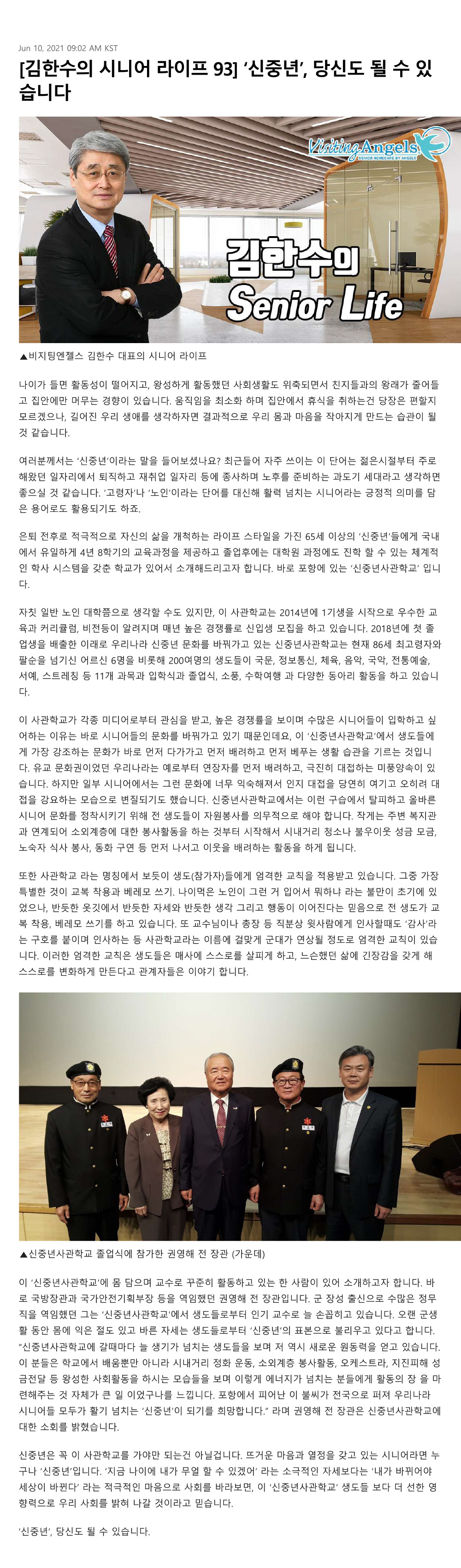 VA소식 미디어 지점 활동 및 소식 채용 채용 신청서 제목[크리스천 투데이 칼럼 93] '신중년', 당신도 될 수 있습니다2021-08-12 14:06카테고리칼럼작성자비지팅엔젤스 코리아 Information 목록 댓글 [0] 더보기이전[크리스천 투데이 칼럼 94] 끊임없는 자기개발, 공부하는 시니어 케어매니저비지팅엔젤스 코리아 Information2021-08-12다음[크리스천 투데이 칼럼 92] 갱년기? 중년 우울증? 우리는 그런 거 몰라요비지팅엔젤스 코리아 Information2021-08-12 Powered by MangBoard | 망보드 스토어