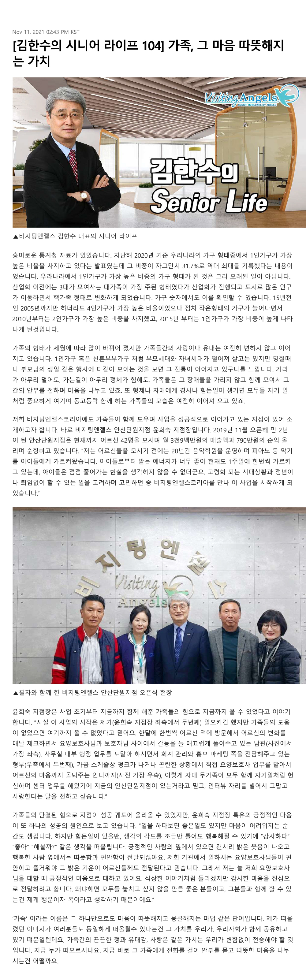 VA소식 미디어 지점 활동 및 소식 채용 채용 신청서 제목[크리스천 투데이 칼럼 104] 가족, 그 마음 따뜻해지는 가치2021-11-11 18:21카테고리칼럼작성자비지팅엔젤스 코리아 Information 목록 댓글 [0] 더보기이전[크리스천 투데이 칼럼 105] 사람이 미래다비지팅엔젤스 코리아 Information2021-11-30다음[크리스천 투데이 칼럼 103] 여가 활동도 전문가처럼비지팅엔젤스 코리아 Information2021-11-11 Powered by MangBoard | 망보드 스토어