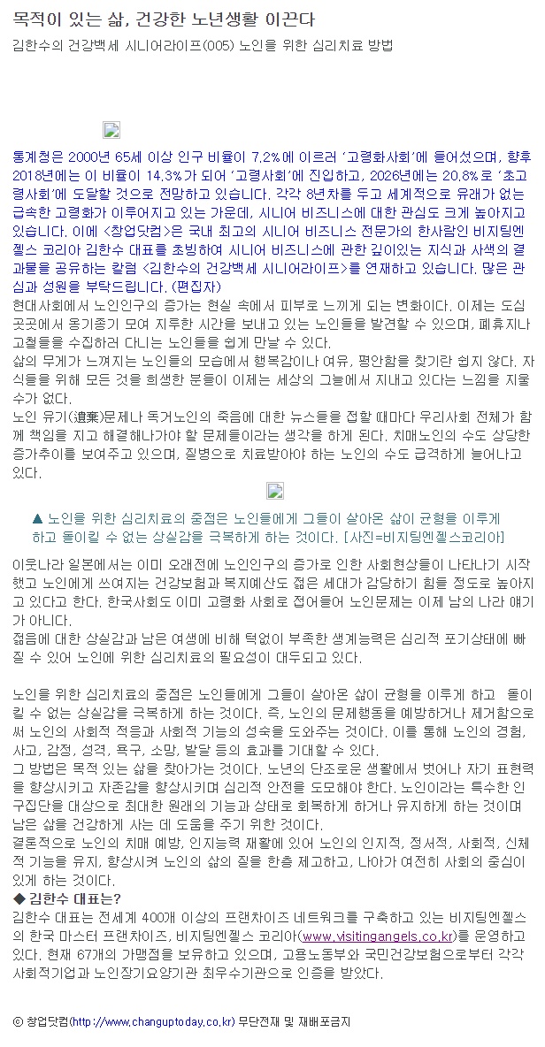 VA소식 미디어 지점 활동 및 소식 채용 채용 신청서 제목[창업닷컴 칼럼 005] 목적이 있는 삶, 건강한 노년생활 이끈다2021-04-09 11:28카테고리칼럼작성자비지팅엔젤스 코리아 Information(2012-11-09) 목록 댓글 [0] 더보기이전[창업닷컴 칼럼 006] 황혼재혼 대책이 필요하다비지팅엔젤스 코리아 Information2021-04-09다음[창업닷컴 칼럼 004] 참된 노년의 삶, 지금부터 준비해야 한다비지팅엔젤스 코리아 Information2021-04-09 Powered by MangBoard | 망보드 스토어