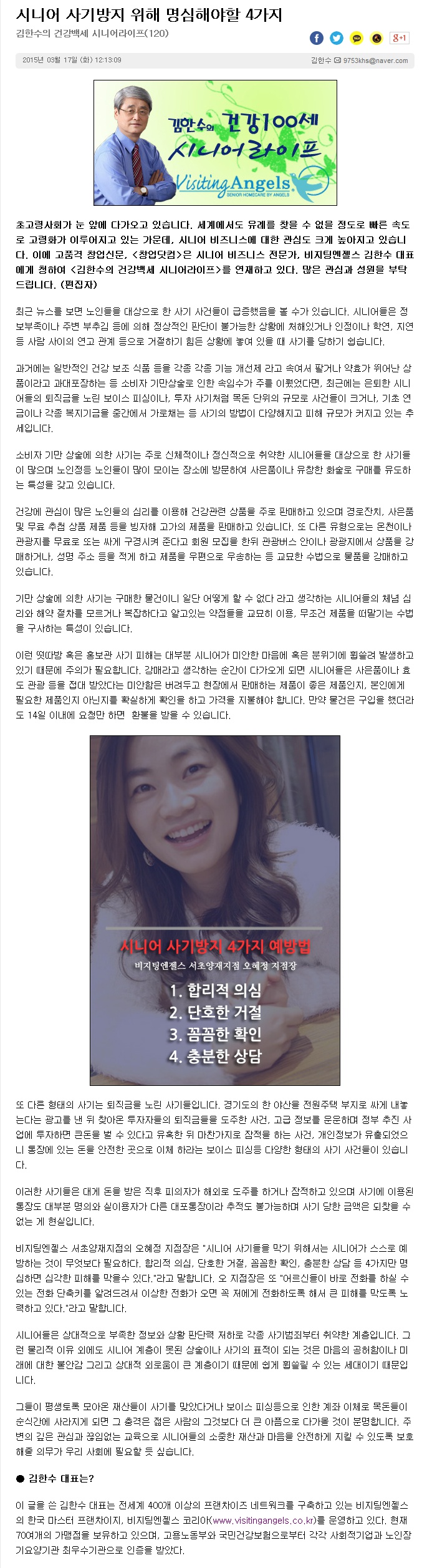 VA소식 미디어 지점 활동 및 소식 채용 채용 신청서 제목[창업닷컴 칼럼 120] 시니어 사기방지 위해 명심해야 할 4가지2021-06-23 14:15카테고리칼럼작성자비지팅엔젤스 코리아 Information 목록 댓글 [0] 더보기이전[창업닷컴 칼럼 121] 64만 저소득 무의탁 노인의 식사 걱정비지팅엔젤스 코리아 Information2021-06-23다음[창업닷컴 칼럼 119] 할머니가 해주신 음식은 왜 짜고 달까?비지팅엔젤스 코리아 Information2021-06-23 Powered by MangBoard | 망보드 스토어