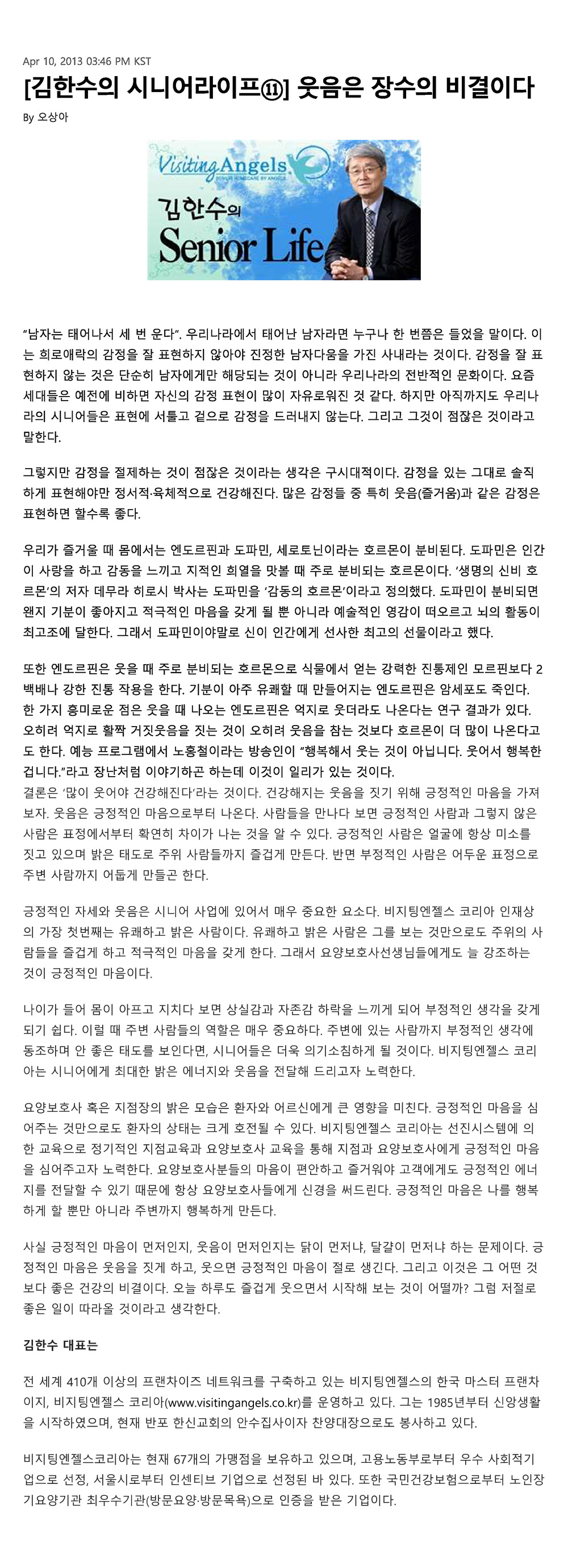 VA소식 미디어 지점 활동 및 소식 채용 채용 신청서 제목[크리스천 투데이 칼럼 11] 웃음의 장수는 비결이다2021-07-20 15:03카테고리칼럼작성자비지팅엔젤스 코리아 Information 목록 댓글 [0] 더보기이전[크리스천 투데이 칼럼 12] 반려동물과 함께 걸어가는 노후의 삶비지팅엔젤스 코리아 Information2021-07-20다음[크리스천 투데이 칼럼 10] 자연 속에서 사는 사람이 장수비지팅엔젤스 코리아 Information2021-07-20 Powered by MangBoard | 망보드 스토어