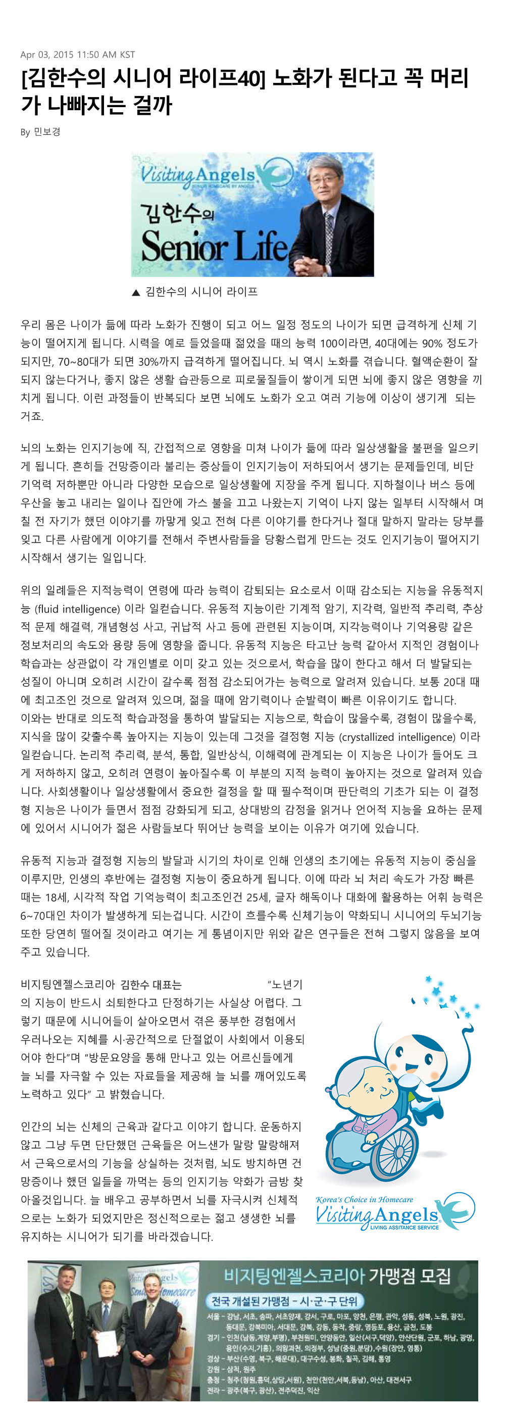 VA소식 미디어 지점 활동 및 소식 채용 채용 신청서 제목[크리스천 투데이 칼럼 40] 노화가 된다고 꼭 머리가 나빠지는걸까2021-07-30 17:24카테고리칼럼작성자비지팅엔젤스 코리아 Information 목록 댓글 [0] 더보기이전[크리스천 투데이 칼럼 41] 숫자가 모든 것을 다 말해주진 않아요비지팅엔젤스 코리아 Information2021-08-06다음[크리스천 투데이 칼럼 39] 시니어들에게 밥 한끼의 의미비지팅엔젤스 코리아 Information2021-07-21 Powered by MangBoard | 망보드 스토어