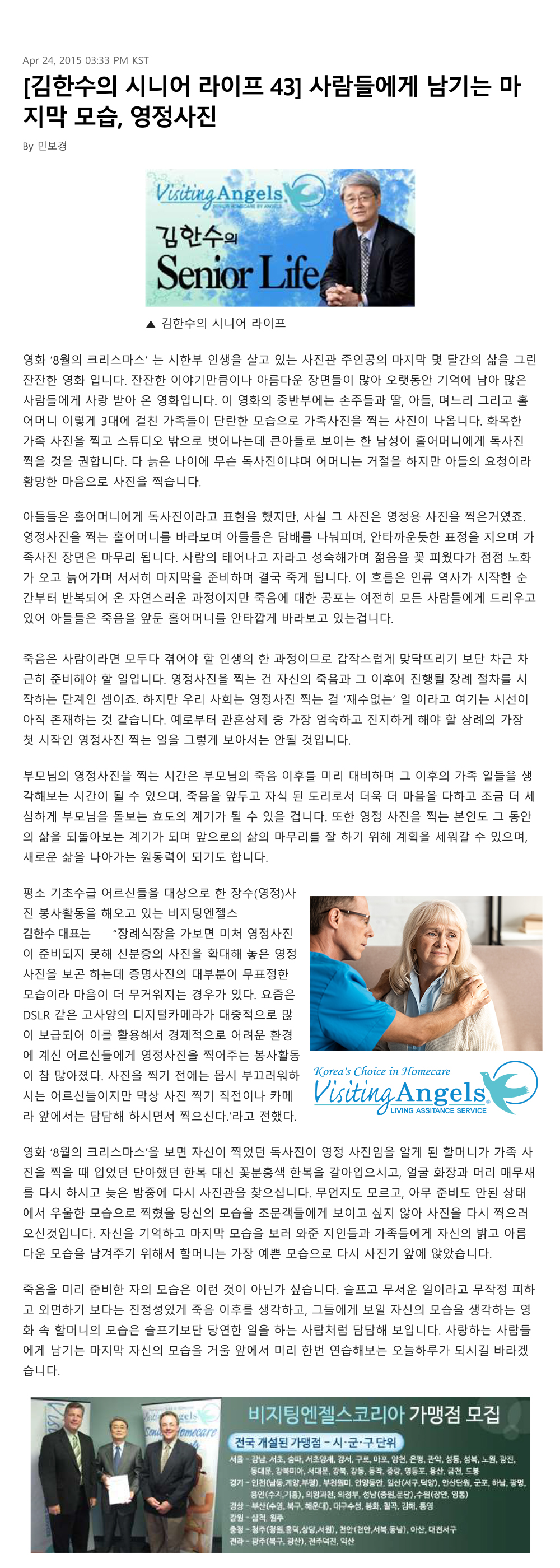 VA소식 미디어 지점 활동 및 소식 채용 채용 신청서 제목[크리스천 투데이 칼럼 43] 사람들에게 남기는 마지막 모습, 영정사진2021-08-09 17:40카테고리칼럼작성자비지팅엔젤스 코리아 Information 목록 댓글 [0] 더보기이전[크리스천 투데이 칼럼 44] 농촌 노인들에게 무슨 일이...비지팅엔젤스 코리아 Information2021-08-11다음[크리스천 투데이 칼럼 42] 장애인날에 부쳐비지팅엔젤스 코리아 Information2021-08-09 Powered by MangBoard | 망보드 스토어