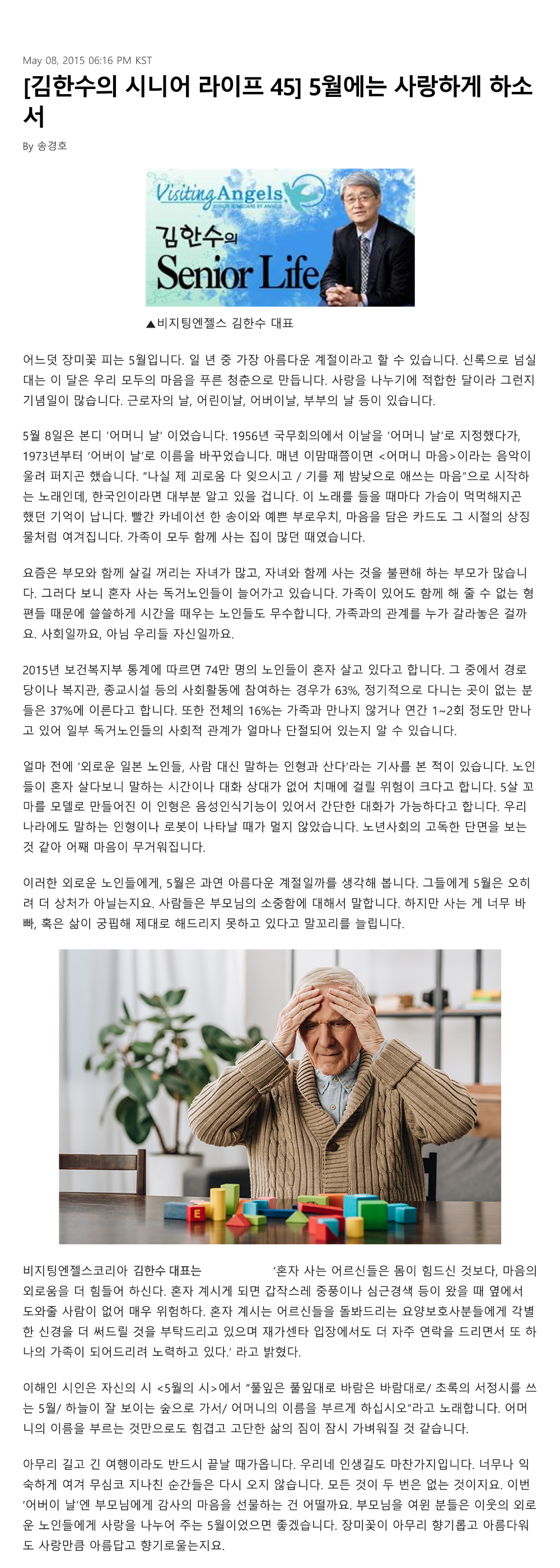 VA소식 미디어 지점 활동 및 소식 채용 채용 신청서 제목[크리스천 투데이 칼럼 45] 5월에는 사랑하게 하소서2021-08-11 14:45카테고리칼럼작성자비지팅엔젤스 코리아 Information 목록 댓글 [0] 더보기이전[크리스천 투데이 칼럼 46] 남아있는 날들을 위한 소고(小考)비지팅엔젤스 코리아 Information2021-08-11다음[크리스천 투데이 칼럼 44] 농촌 노인들에게 무슨 일이...비지팅엔젤스 코리아 Information2021-08-11 Powered by MangBoard | 망보드 스토어
