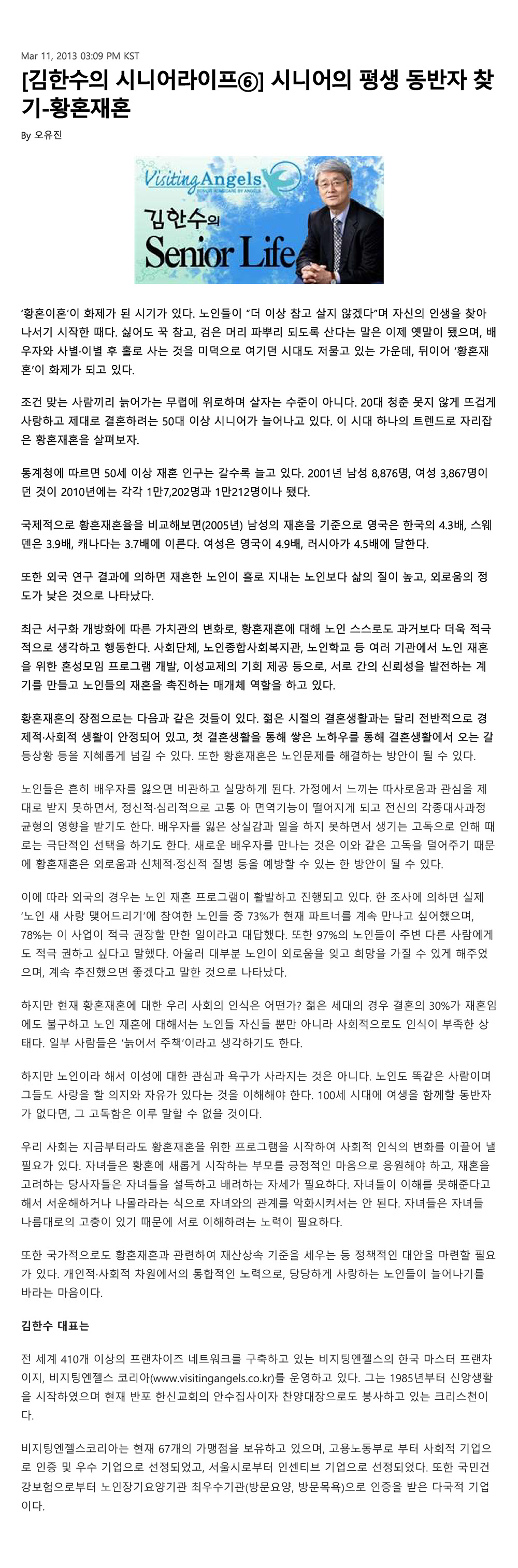 VA소식 미디어 지점 활동 및 소식 채용 채용 신청서 제목[크리스천 투데이 칼럼 6] 시니어의 평생 동반자 찾기 - 황혼재혼2021-07-20 13:43카테고리칼럼작성자비지팅엔젤스 코리아 Information 목록 댓글 [0] 더보기이전[크리스천 투데이 칼럼 7] 목적 있는 삶, 노인 문제 해결이 열쇠다비지팅엔젤스 코리아 Information2021-07-20다음[크리스천 투데이 칼럼 5] 은퇴 후 창업은 철저한 준비가 동반되어야비지팅엔젤스 코리아 Information2021-07-20 Powered by MangBoard | 망보드 스토어