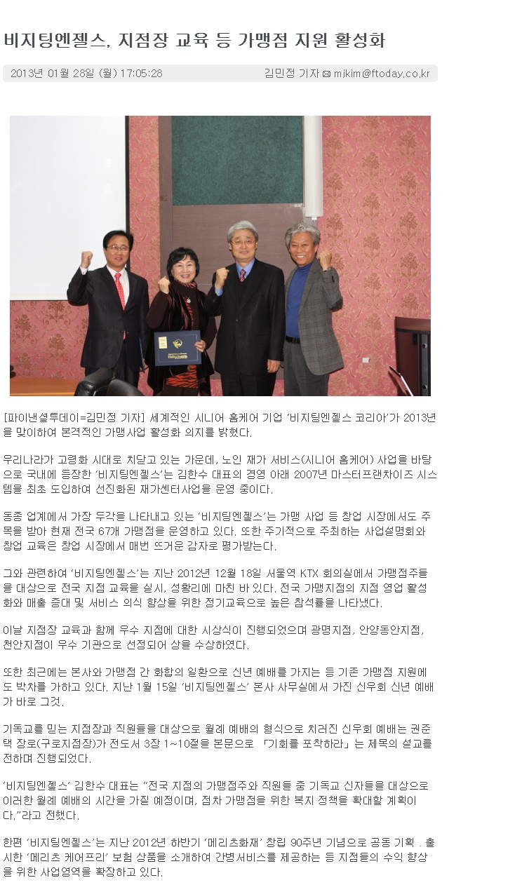 VA소식 미디어 지점 활동 및 소식 채용 채용 신청서 제목[파이낸셜투데이]비지팅엔젤스, 지점장 교육 등 가맹점 지원 활성화2020-04-10 11:08카테고리신문작성자비지팅엔젤스 코리아 Information(2013.01.28) 목록 댓글 [0] 더보기이전[파이낸셜투데이] 시니어홈케어 기업 ‘비지팅엔젤스’, 새해맞이 예배로 화합 다져비지팅엔젤스 코리아 Information2020-04-10다음[파이낸셜투데이] 2013년 창업 시장의 화두 '시니어 홈케어' 사업은 무엇?비지팅엔젤스 코리아 Information2020-04-10 Powered by MangBoard | 망보드 스토어