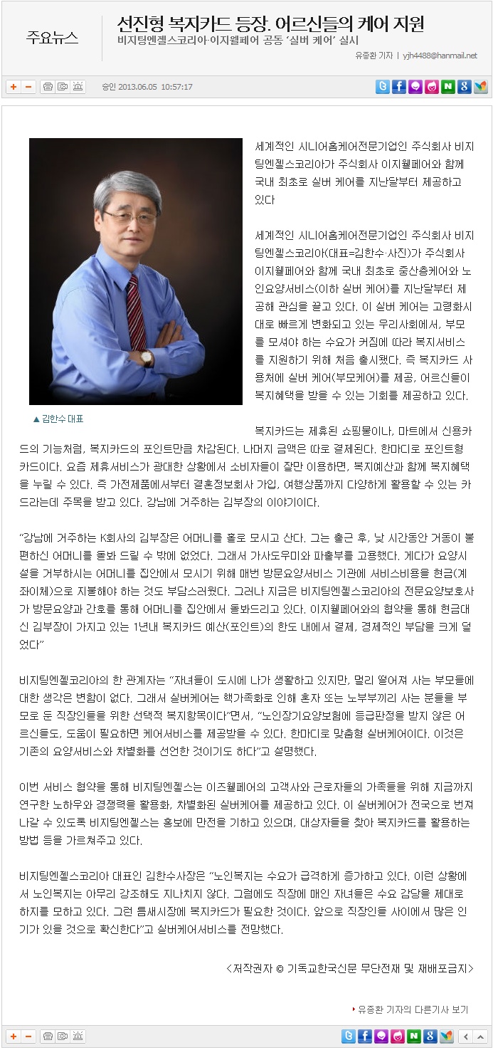 VA소식 미디어 지점 활동 및 소식 채용 채용 신청서 제목[기독교한국신문] 선진형 복지카드 등장. 어르신들의 케어 지원2020-04-10 11:13카테고리신문작성자비지팅엔젤스 코리아 Information(2013.06.05) 목록 댓글 [0] 더보기이전[크리스천투데이] 비지팅엔젤스의 방문요양, 메리츠화재 보장보험 통해 받는다비지팅엔젤스 코리아 Information2020-04-10다음[매일경제] 바쁜 직장인 대신 효자 노릇하는 복지카드는비지팅엔젤스 코리아 Information2020-04-10 Powered by MangBoard | 망보드 스토어