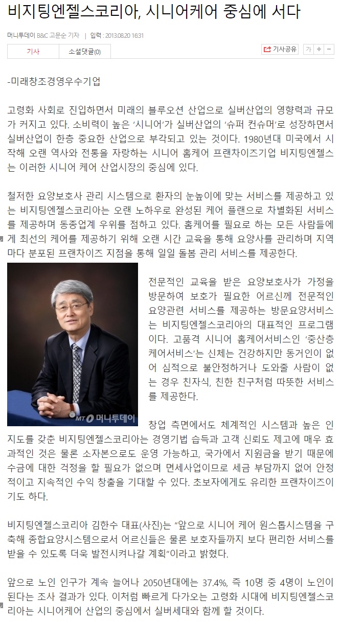 VA소식 미디어 지점 활동 및 소식 채용 채용 신청서 제목[머니투데이] 미래창조경영우수기업 - 비지팅엔젤스코리아, 시니어케어 중심에 서다2020-04-10 11:21카테고리신문작성자비지팅엔젤스 코리아 Information 목록 댓글 [0] 더보기이전[파이낸셜뉴스] 노인요양 '홈케어' 국내 상륙비지팅엔젤스 코리아 Information2020-04-10다음[머니투데이] 비지팅엔젤스 코리아, 소자본으로도 안정적 수익 가능한 이유비지팅엔젤스 코리아 Information2020-04-10 Powered by MangBoard | 망보드 스토어