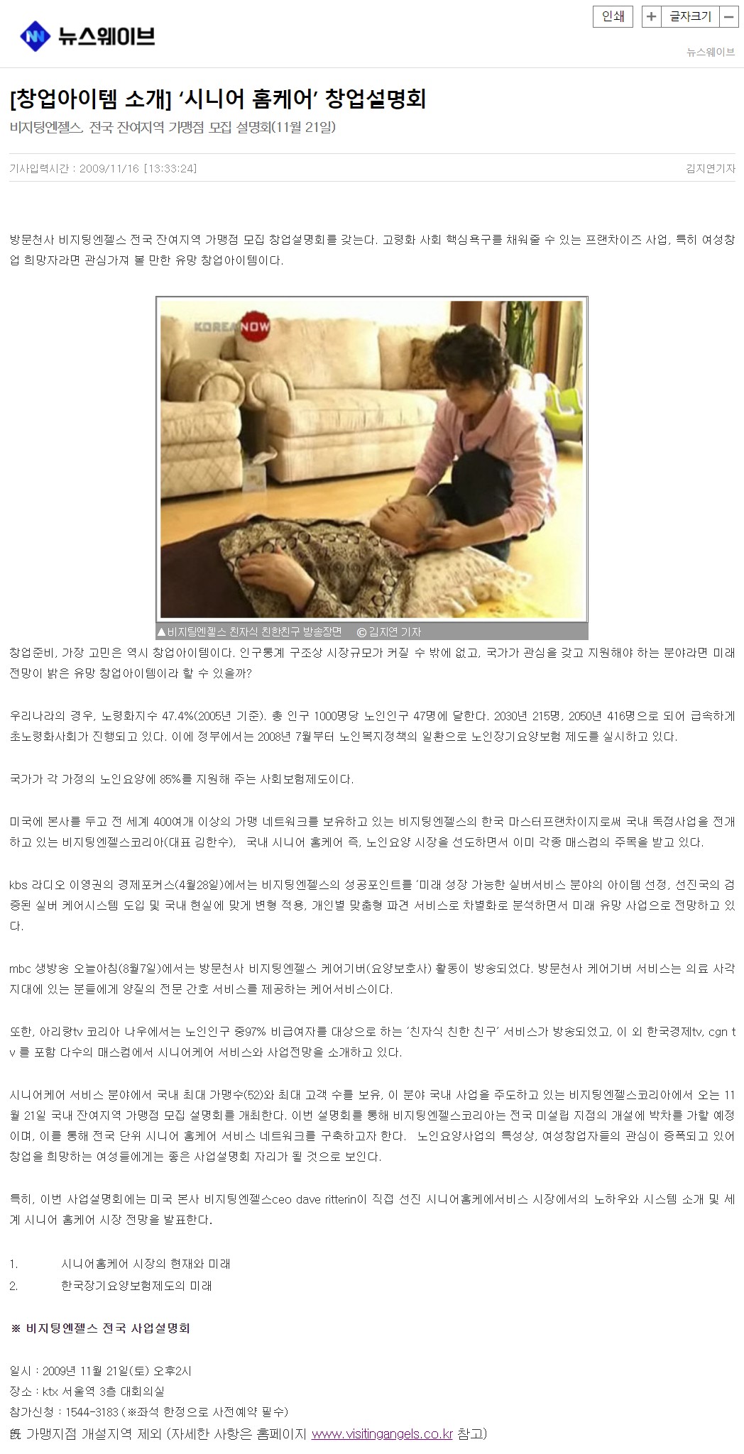 VA소식 미디어 지점 활동 및 소식 채용 채용 신청서 제목[뉴스웨이브] '시니어 홈케어' 창업설명회2020-04-12 15:15카테고리신문작성자비지팅엔젤스 코리아 Information(2009.11.16) 목록 댓글 [0] 더보기이전[연합뉴스] <여성창업 프랜차이즈> 실버산업 프랜차이즈 사업설명회비지팅엔젤스 코리아 Information2020-04-12다음[아시아경제] 비지팅엔젤스, 노인재가봉사 가맹사업 확대비지팅엔젤스 코리아 Information2020-04-12 Powered by MangBoard | 망보드 스토어