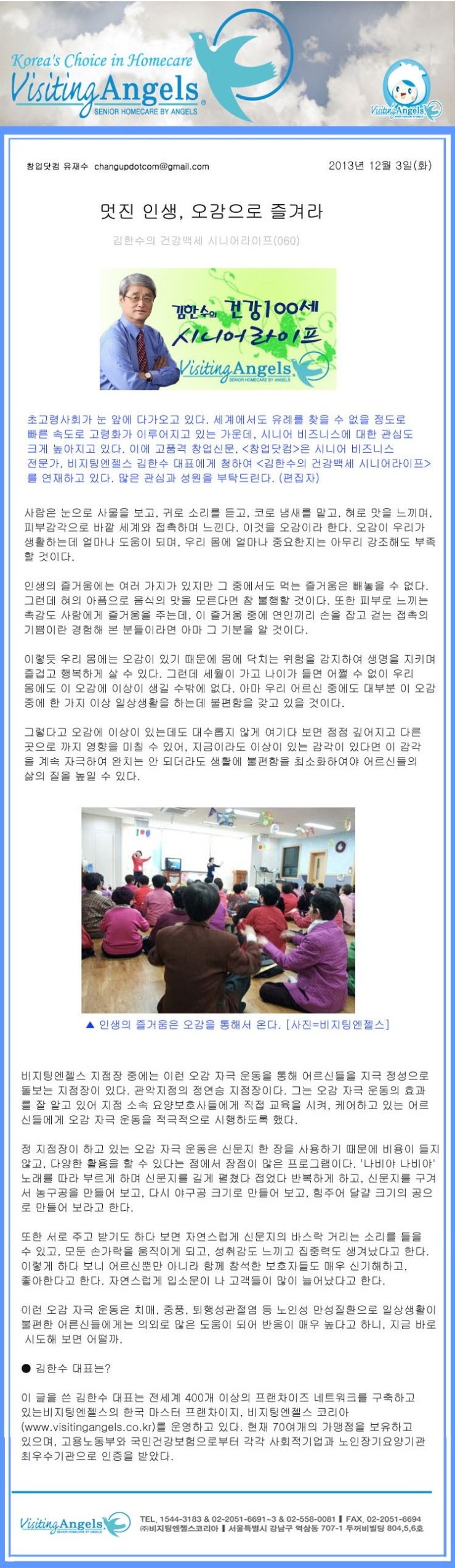 VA소식 미디어 지점 활동 및 소식 채용 채용 신청서 제목[창업닷컴 칼럼 060] 멋진 인생, 오감으로 즐겨라2021-06-22 11:19카테고리칼럼작성자비지팅엔젤스 코리아 Information 목록 댓글 [0] 더보기이전[창업닷컴 칼럼 061] 노인 자살률 1위, 부끄럽지 않나요?비지팅엔젤스 코리아 Information2021-06-22다음[창업닷컴 칼럼 059] 우리 모두의 문제처럼 생각하기의 어려움비지팅엔젤스 코리아 Information2021-06-22 Powered by MangBoard | 망보드 스토어