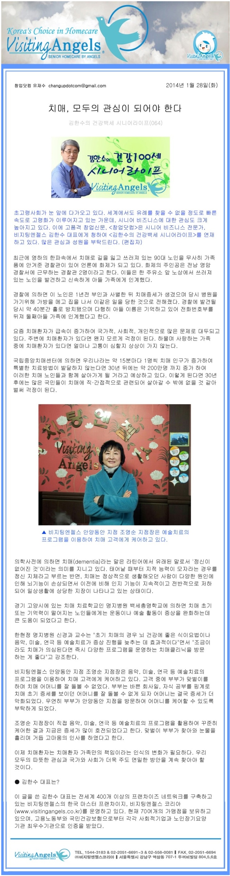 VA소식 미디어 지점 활동 및 소식 채용 채용 신청서 제목[창업닷컴 칼럼 064] 치매, 모두의 관심이 되어야 한다2021-06-22 14:29카테고리칼럼작성자비지팅엔젤스 코리아 Information 목록 댓글 [0] 더보기이전[창업닷컴 칼럼 065] 당당하게 요구해, 노노세대 위한 공간비지팅엔젤스 코리아 Information2021-06-22다음[창업닷컴 칼럼 063] 노인경제활동의 재발견, 노인을 일하게 하라비지팅엔젤스 코리아 Information2021-06-22 Powered by MangBoard | 망보드 스토어