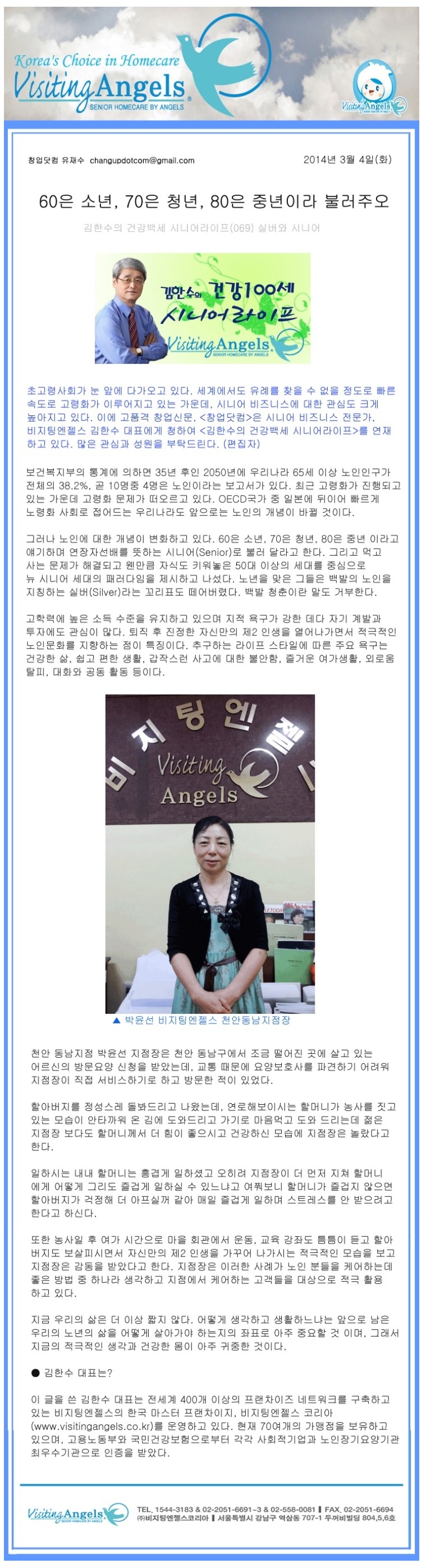 VA소식 미디어 지점 활동 및 소식 채용 채용 신청서 제목[창업닷컴 칼럼 069] 60은 소년, 70은 청년, 80은 중년이라 불러주오2021-06-22 15:25카테고리칼럼작성자비지팅엔젤스 코리아 Information 목록 댓글 [0] 더보기이전[창업닷컴 칼럼 070] 다시 시작해, 시니어 인턴비지팅엔젤스 코리아 Information2021-06-22다음[창업닷컴 칼럼 068] 경험을 소비하라, 행복이 증진된다비지팅엔젤스 코리아 Information2021-06-22 Powered by MangBoard | 망보드 스토어