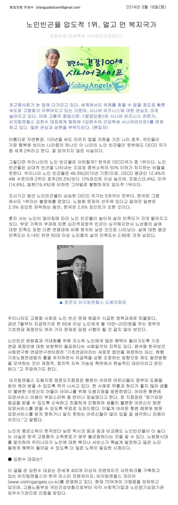 VA소식 미디어 지점 활동 및 소식 채용 채용 신청서 제목[창업닷컴 칼럼 071] 노인빈곤율 압도적 1위, 멀고 먼 복지국가2021-06-23 09:49카테고리칼럼작성자비지팅엔젤스 코리아 Information 목록 댓글 [0] 더보기이전[창업닷컴 칼럼 072] 미소짓고 배려하는 시니어가 되면 좋은 이유비지팅엔젤스 코리아 Information2021-06-23다음[창업닷컴 칼럼 070] 다시 시작해, 시니어 인턴비지팅엔젤스 코리아 Information2021-06-22 Powered by MangBoard | 망보드 스토어