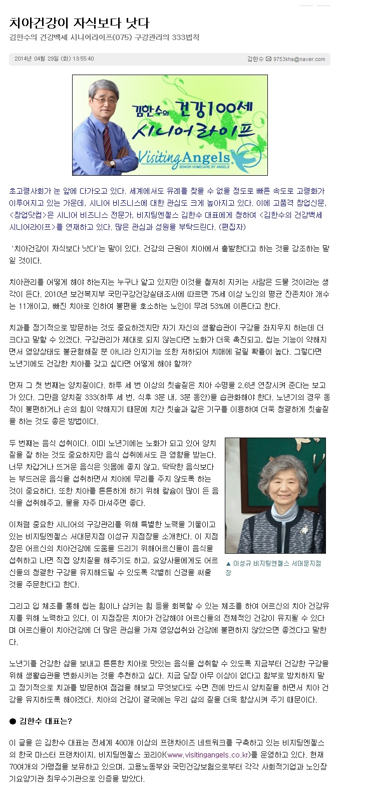 VA소식 미디어 지점 활동 및 소식 채용 채용 신청서 제목[창업닷컴 칼럼 075] 치아건강이 자식보다 낫다2021-06-23 09:52카테고리칼럼작성자비지팅엔젤스 코리아 Information 목록 댓글 [0] 더보기이전[창업닷컴 칼럼 076] 노후 여가생활 시간을 '골든타임' 이라고 부르자비지팅엔젤스 코리아 Information2021-06-23다음[창업닷컴 칼럼 074] 보약보다 더 좋은 운동, 지금부터 시작하자비지팅엔젤스 코리아 Information2021-06-23 Powered by MangBoard | 망보드 스토어