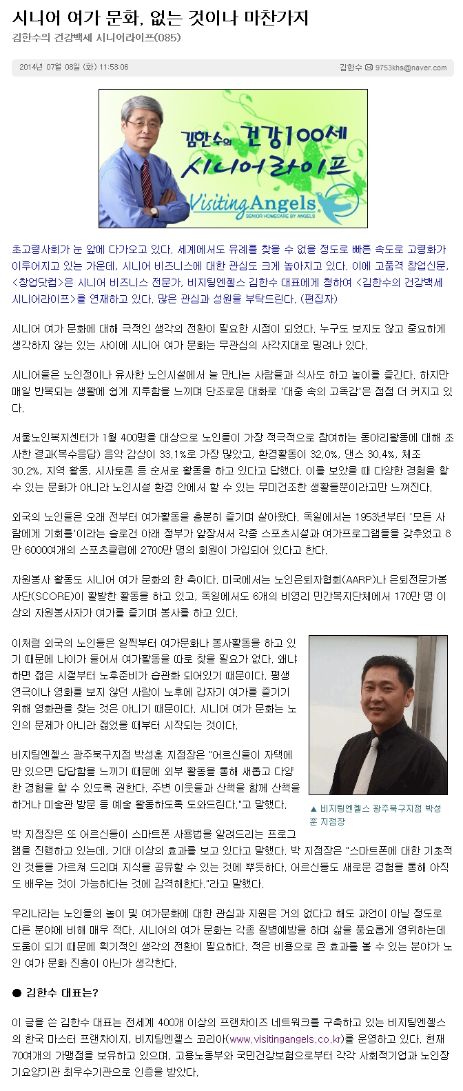 VA소식 미디어 지점 활동 및 소식 채용 채용 신청서 제목[창업닷컴 칼럼 085] 시니어 여가 문화, 없는 것이나 마찬가지2021-06-23 10:20카테고리칼럼작성자비지팅엔젤스 코리아 Information 목록 댓글 [0] 더보기이전[창업닷컴 칼럼 086] 하루 30분씩 걷는 것이 진리다비지팅엔젤스 코리아 Information2021-06-23다음[창업닷컴 칼럼 084] 뼈가 알려주는 건강신호비지팅엔젤스 코리아 Information2021-06-23 Powered by MangBoard | 망보드 스토어