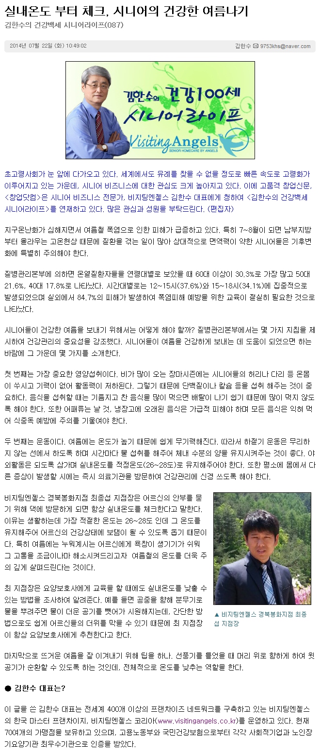 VA소식 미디어 지점 활동 및 소식 채용 채용 신청서 제목[창업닷컴 칼럼 087] 실내온도부터 체크, 시니어의 건강한 여름나기2021-06-23 11:13카테고리칼럼작성자비지팅엔젤스 코리아 Information 목록 댓글 [0] 더보기이전[창업닷컴 칼럼 089] 탱탱한 피부로 생생한 젊음을 즐겨보자비지팅엔젤스 코리아 Information2021-06-23다음[창업닷컴 칼럼 086] 하루 30분씩 걷는 것이 진리다비지팅엔젤스 코리아 Information2021-06-23 Powered by MangBoard | 망보드 스토어