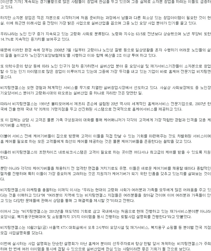 VA소식 미디어 지점 활동 및 소식 채용 채용 신청서 제목[한경 BTN뉴스] 변화하는 실버 창업아이템… ‘노인요양 복합형 프랜차이즈’2020-04-10 09:27카테고리신문작성자비지팅엔젤스 코리아 Information(2011.10.28) 목록 댓글 [0] 더보기이전[매일경제] 60세에 창업해서 연 15억 `대박`비지팅엔젤스 코리아 Information2020-04-10다음[한경 BTN뉴스] 실버산업 '비지팅엔젤스'의 또다른 변신비지팅엔젤스 코리아 Information2020-04-10 Powered by MangBoard | 망보드 스토어