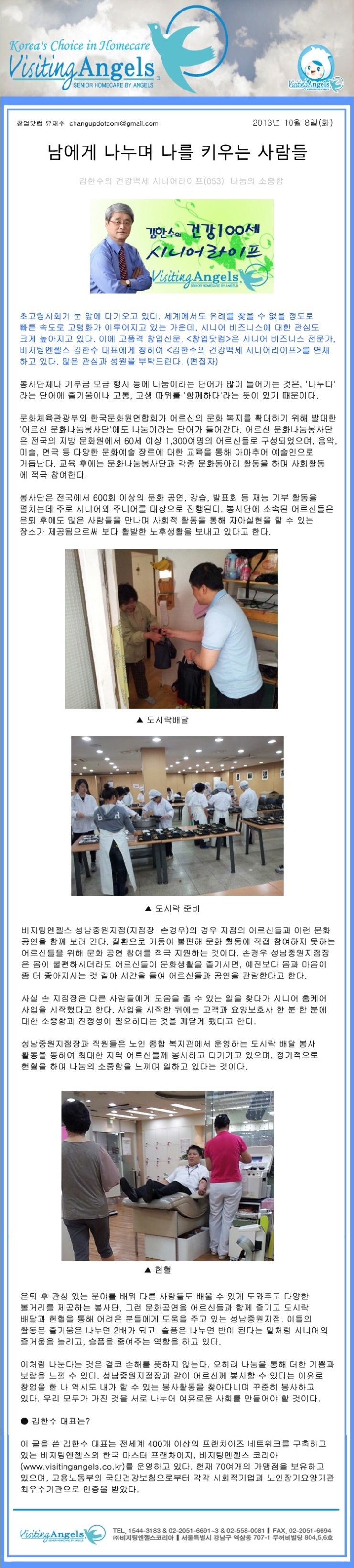 VA소식 미디어 지점 활동 및 소식 채용 채용 신청서 제목[창업닷컴 칼럼 053] 남에게 나누며 나를 키우는 사람들2021-06-22 10:56카테고리칼럼작성자비지팅엔젤스 코리아 Information 목록 댓글 [0] 더보기이전[창업닷컴 칼럼 055] 지금 필요한 것은 밝은 미소와 긍정적인 생각비지팅엔젤스 코리아 Information2021-06-22다음[창업닷컴 칼럼 052] 치매, 당신의 일인가 아닌가?비지팅엔젤스 코리아 Information2021-06-22 Powered by MangBoard | 망보드 스토어