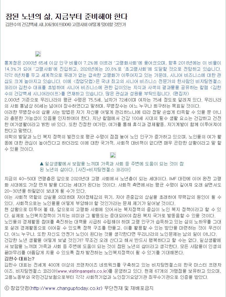 VA소식 미디어 지점 활동 및 소식 채용 채용 신청서 제목[창업닷컴 칼럼 004] 참된 노년의 삶, 지금부터 준비해야 한다2021-04-09 11:25카테고리칼럼작성자비지팅엔젤스 코리아 Information(2012-11-02) 목록 댓글 [0] 더보기이전[창업닷컴 칼럼 005] 목적이 있는 삶, 건강한 노년생활 이끈다비지팅엔젤스 코리아 Information2021-04-09다음[창업닷컴 칼럼 003] 경제활동, 교육, 여가의 순환이 건강백세 비법비지팅엔젤스 코리아 Information2021-04-09 Powered by MangBoard | 망보드 스토어