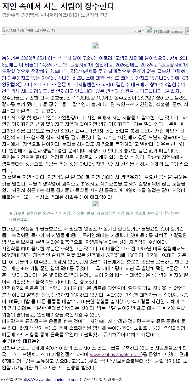 VA소식 미디어 지점 활동 및 소식 채용 채용 신청서 제목[창업닷컴 칼럼 010] 자연 속에서 사는 사람이 장수한다2021-04-09 11:51카테고리칼럼작성자비지팅엔젤스 코리아 Information(2012-12-14) 목록 댓글 [0] 더보기이전[창업닷컴 칼럼 011] 유쾌하고 밝은 사람이 감동의 호르몬이다비지팅엔젤스 코리아 Information2021-04-12다음[창업닷컴 칼럼 009] 생산적 고령화, 활동적 고령화로 가는 길비지팅엔젤스 코리아 Information2021-04-09 Powered by MangBoard | 망보드 스토어