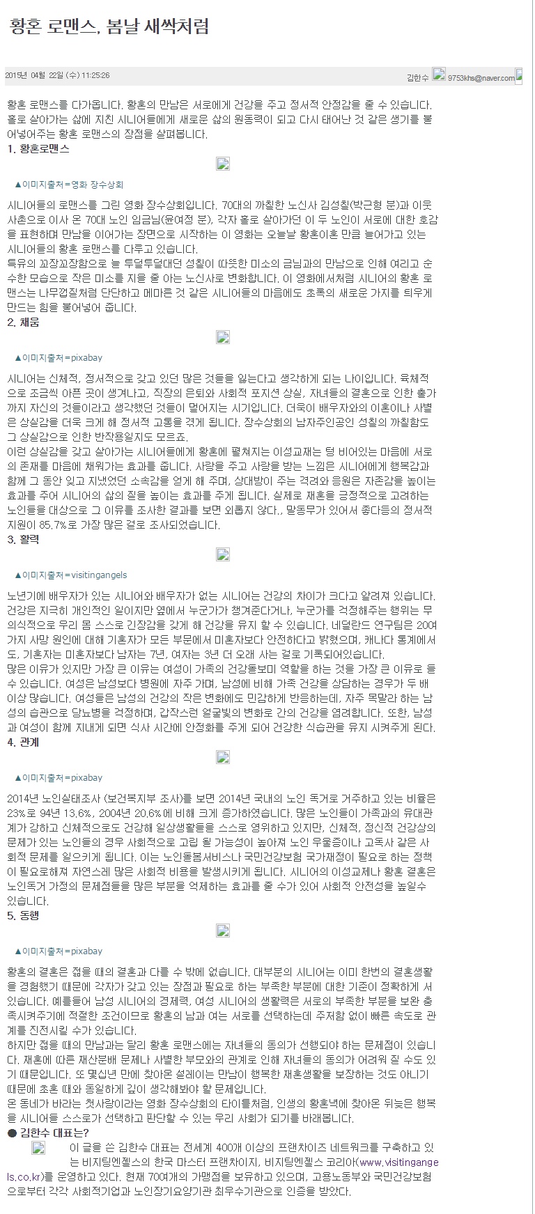 VA소식 미디어 지점 활동 및 소식 채용 채용 신청서 제목[창업닷컴 칼럼 125] 황혼 로맨스, 봄날 새싹처럼2021-06-23 16:56카테고리칼럼작성자비지팅엔젤스 코리아 Information 목록 댓글 [0] 더보기이전[창업닷컴 칼럼 126] 웃음을 생활화하여 오래오래 살아보자비지팅엔젤스 코리아 Information2021-06-23다음[창업닷컴 칼럼 124] 졸음이 몰려온다면비지팅엔젤스 코리아 Information2021-06-23 Powered by MangBoard | 망보드 스토어