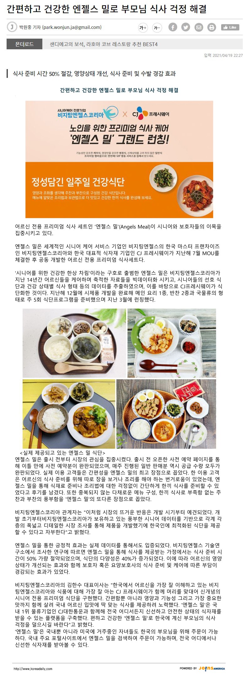 VA소식 미디어 지점 활동 및 소식 채용 채용 신청서 제목[미주 중앙일보] 간편하고 건강한 엔젤스 밀로 부모님 식사 걱정 해결2021-07-15 13:47카테고리신문작성자비지팅엔젤스 코리아 Information 목록 댓글 [0] 더보기이전[서울신문] 재가 장기요양기관 평가결과, '비지팅엔젤스코리아' 최우수기관 압도적 1위비지팅엔젤스 코리아 Information2021-07-15다음[서울신문] ‘엔젤스 밀’ 3/22런칭! 사전 예약분 완판비지팅엔젤스 코리아 Information2021-07-15 Powered by MangBoard | 망보드 스토어