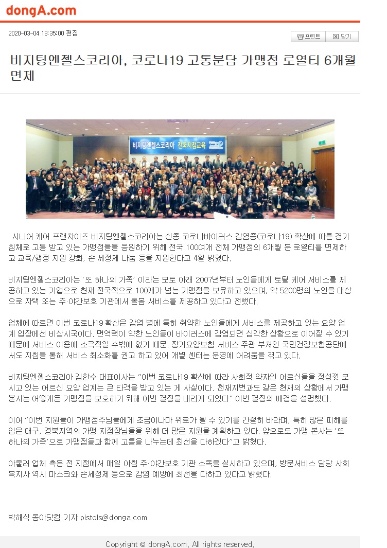 VA소식 미디어 지점 활동 및 소식 채용 채용 신청서 제목[동아일보] 비지팅엔젤스코리아, 코로나19 고통분담 가맹점 로열티 6개월 면제2020-04-14 18:55카테고리신문작성자비지팅엔젤스 코리아 Information 목록 댓글 [0] 더보기이전[동아일보] 비지팅엔젤스코리아, 가맹점 고통 분담 위한 2차 지원책 발표비지팅엔젤스 코리아 Information2020-04-15다음[뉴스메이커] '홈케어 서비스 사업은 우리의 미래를 위한 사업' (2019년 10월호)비지팅엔젤스 코리아 Information2020-04-13 Powered by MangBoard | 망보드 스토어