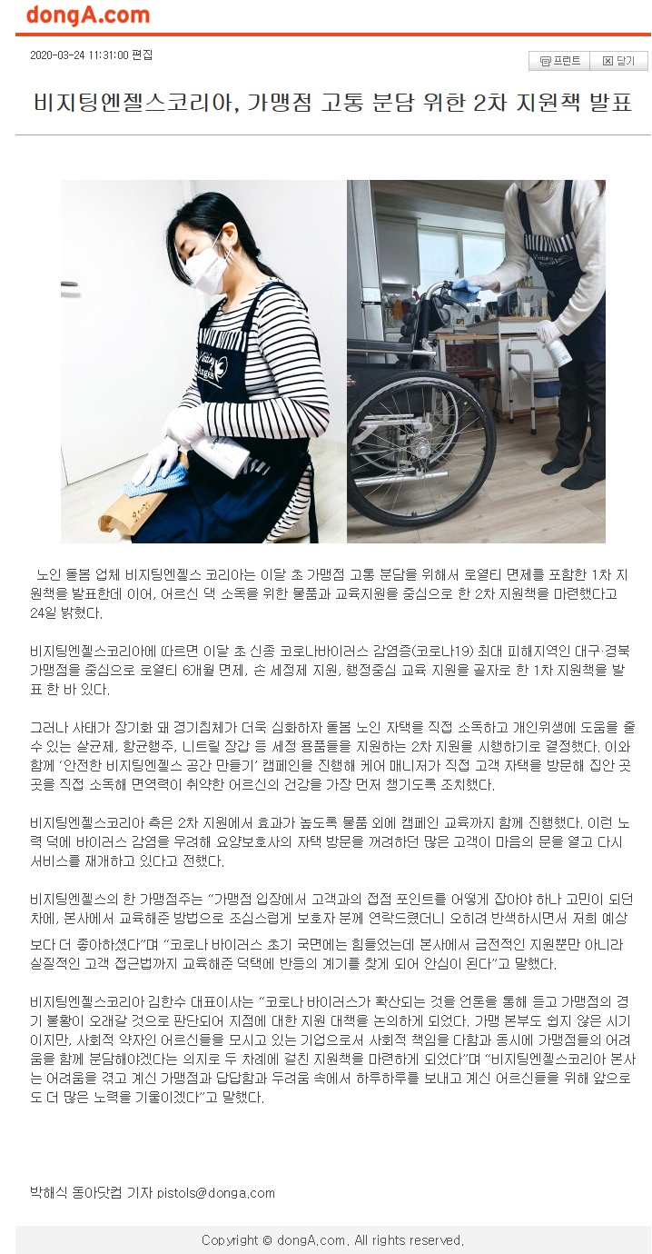 VA소식 미디어 지점 활동 및 소식 채용 채용 신청서 제목[동아일보] 비지팅엔젤스코리아, 가맹점 고통 분담 위한 2차 지원책 발표2020-04-15 10:01카테고리신문작성자비지팅엔젤스 코리아 Information2020.03.24 목록 댓글 [0] 더보기이전비지팅엔젤스코리아, ‘착한 프랜차이즈’로 인정받아비지팅엔젤스 코리아 Information2020-04-27다음[동아일보] 비지팅엔젤스코리아, 코로나19 고통분담 가맹점 로열티 6개월 면제비지팅엔젤스 코리아 Information2020-04-14 Powered by MangBoard | 망보드 스토어