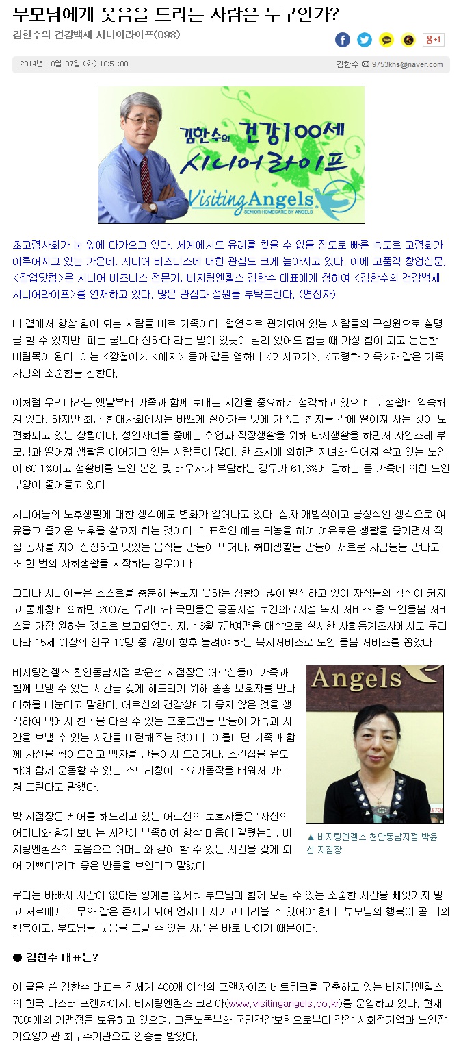 VA소식 미디어 지점 활동 및 소식 채용 채용 신청서 제목[창업닷컴 칼럼 098] 부모님에게 웃음을 드리는 사람은 누구인가?2021-06-23 12:00카테고리칼럼작성자비지팅엔젤스 코리아 Information 목록 댓글 [0] 더보기이전[창업닷컴 칼럼 099] 글자 한 자 한 자에 담긴 눈물비지팅엔젤스 코리아 Information2021-06-23다음[창업닷컴 칼럼 097] 자원봉사는 삶의 새로운 원동력이다비지팅엔젤스 코리아 Information2021-06-23 Powered by MangBoard | 망보드 스토어