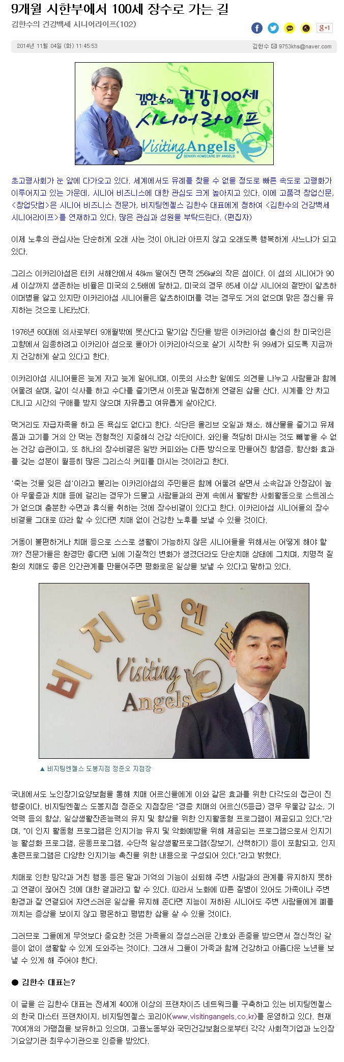 VA소식 미디어 지점 활동 및 소식 채용 채용 신청서 제목[창업닷컴 칼럼 102] 9개월 시한부에서 100세 장수로 가는 길2021-06-23 13:15카테고리칼럼작성자비지팅엔젤스 코리아 Information 목록 댓글 [0] 더보기이전[창업닷컴 칼럼 103] 일하는 장년, 활력과 보람이 있는 노후를 위하여비지팅엔젤스 코리아 Information2021-06-23다음[창업닷컴 칼럼 100] 조심 조심, 독감과 감기는 완전히 달라요비지팅엔젤스 코리아 Information2021-06-23 Powered by MangBoard | 망보드 스토어