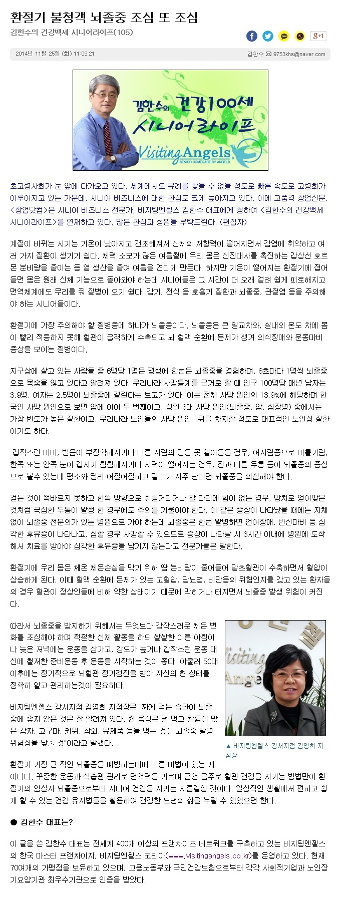 VA소식 미디어 지점 활동 및 소식 채용 채용 신청서 제목[창업닷컴 칼럼 105] 환절기 불청객 뇌졸중 조심 또 조심2021-06-23 13:38카테고리칼럼작성자비지팅엔젤스 코리아 Information 목록 댓글 [0] 더보기이전[창업닷컴 칼럼 106] 스트레칭으로 건강도 펴고, 인생도 펴고비지팅엔젤스 코리아 Information2021-06-23다음[창업닷컴 칼럼 104] 미소짓기 트레이닝으로 8살 젊게 살자비지팅엔젤스 코리아 Information2021-06-23 Powered by MangBoard | 망보드 스토어