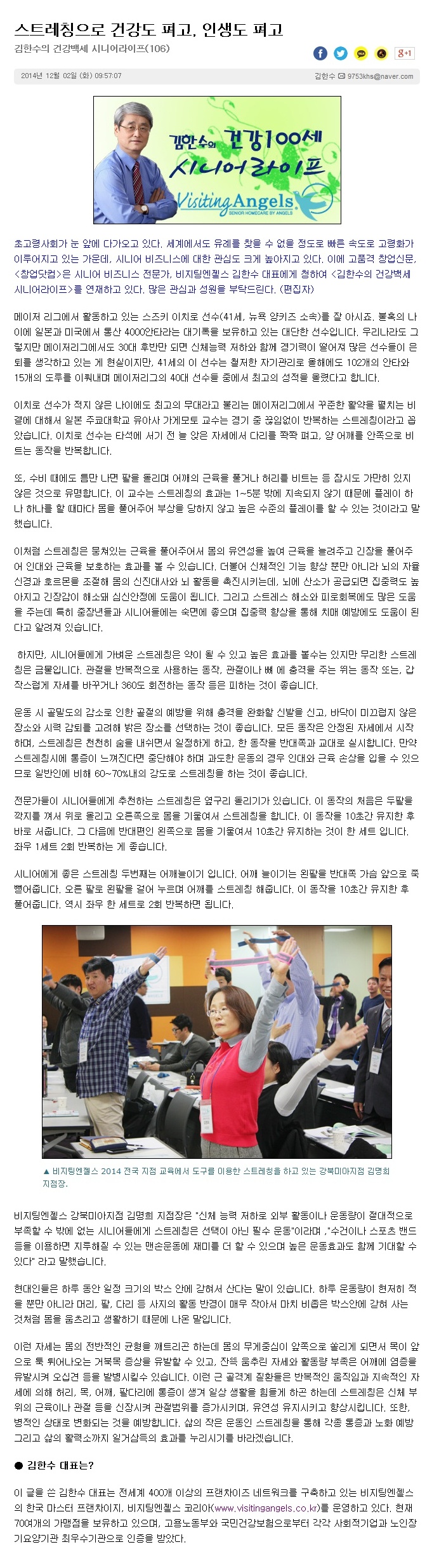 VA소식 미디어 지점 활동 및 소식 채용 채용 신청서 제목[창업닷컴 칼럼 106] 스트레칭으로 건강도 펴고, 인생도 펴고2021-06-23 13:38카테고리칼럼작성자비지팅엔젤스 코리아 Information 목록 댓글 [0] 더보기이전[창업닷컴 칼럼 107] 햇볕은 자연이 시니어들에게 주는 한첩의 보약비지팅엔젤스 코리아 Information2021-06-23다음[창업닷컴 칼럼 105] 환절기 불청객 뇌졸중 조심 또 조심비지팅엔젤스 코리아 Information2021-06-23 Powered by MangBoard | 망보드 스토어