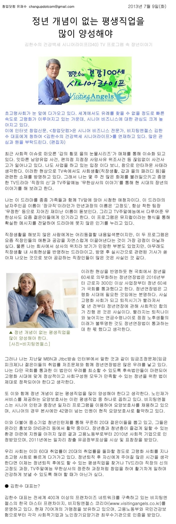 VA소식 미디어 지점 활동 및 소식 채용 채용 신청서 제목[창업닷컴 칼럼 040] 정년개념이 없는 평생직업을 많이 양성해야2021-04-12 16:14카테고리칼럼작성자비지팅엔젤스 코리아 Information 목록 댓글 [0] 더보기이전[창업닷컴 칼럼 041] 아름다운 마무리를 준비하자비지팅엔젤스 코리아 Information2021-04-12다음[창업닷컴 칼럼 038] 나이가 사라진 시대가 왔다. 어모털족의 시대비지팅엔젤스 코리아 Information2021-04-12 Powered by MangBoard | 망보드 스토어