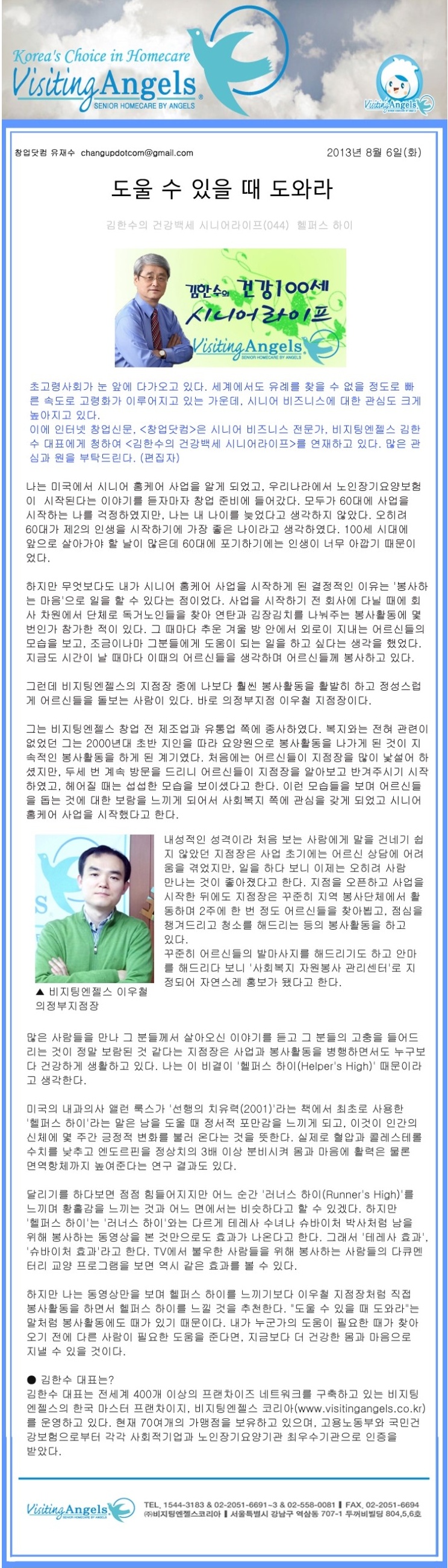 VA소식 미디어 지점 활동 및 소식 채용 채용 신청서 제목[창업닷컴 칼럼 044] 도울때 도와라2021-04-12 16:20카테고리칼럼작성자비지팅엔젤스 코리아 Information 목록 댓글 [0] 더보기이전[창업닷컴 칼럼 045] 고독사에 대한 관심, 지금부터 시작해야비지팅엔젤스 코리아 Information2021-04-12다음[창업닷컴 칼럼 043] 시니어들만의 공간, 경로당은 변화 중비지팅엔젤스 코리아 Information2021-04-12 Powered by MangBoard | 망보드 스토어