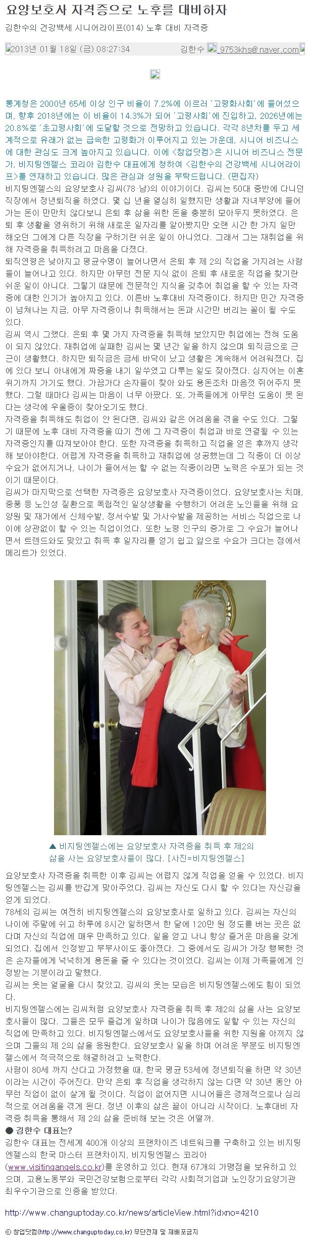 VA소식 미디어 지점 활동 및 소식 채용 채용 신청서 제목[창업닷컴 칼럼 015] 요양보호사 자격증으로 노후를 대비하자2021-04-12 15:38카테고리칼럼작성자비지팅엔젤스 코리아 Information 목록 댓글 [0] 더보기이전[창업닷컴 칼럼 016] 시니어 사업의 힘은 마음을 나누는 것이다비지팅엔젤스 코리아 Information2021-04-12다음[창업닷컴 칼럼 014] 건강주의보, 겨울철 시니어 건강 관리법비지팅엔젤스 코리아 Information2021-04-12 Powered by MangBoard | 망보드 스토어