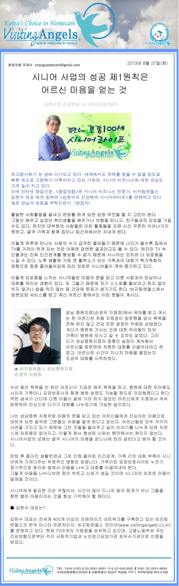 VA소식 미디어 지점 활동 및 소식 채용 채용 신청서 제목[창업닷컴 칼럼 047] 시니어 사업의 성공 제1원칙은 어르신 마음을 얻는 것2021-06-22 10:44카테고리칼럼작성자비지팅엔젤스 코리아 Information 목록 댓글 [0] 더보기이전[창업닷컴 칼럼 048] 시니어에게는 전문가의 도움이 필요하다비지팅엔젤스 코리아 Information2021-06-22다음[창업닷컴 칼럼 046] 시니어만 느낄 수 있는 여행의 매력비지팅엔젤스 코리아 Information2021-06-22 Powered by MangBoard | 망보드 스토어