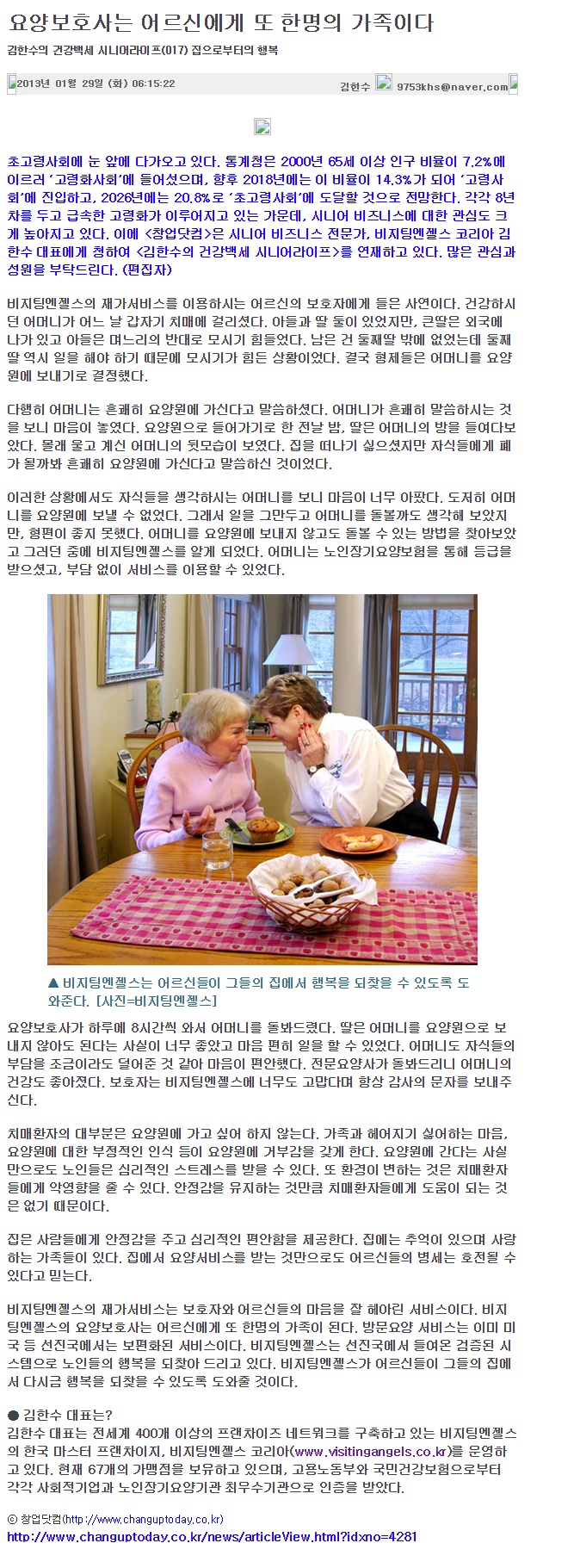 VA소식 미디어 지점 활동 및 소식 채용 채용 신청서 제목[창업닷컴 칼럼 017] 요양보호사는 어르신에게 또 한명의 가족이다2021-04-12 15:42카테고리칼럼작성자비지팅엔젤스 코리아 Information 목록 댓글 [0] 더보기이전[창업닷컴 칼럼 018]긍정적인 마음이 시니어 사업을 성공으로 이끄는 핵이다비지팅엔젤스 코리아 Information2021-04-12다음[창업닷컴 칼럼 016] 시니어 사업의 힘은 마음을 나누는 것이다비지팅엔젤스 코리아 Information2021-04-12 Powered by MangBoard | 망보드 스토어