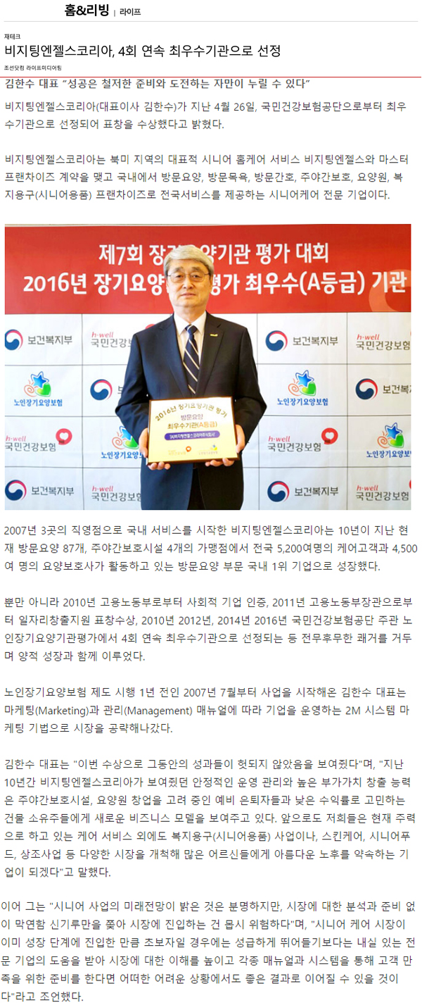 VA소식 미디어 지점 활동 및 소식 채용 채용 신청서 제목[조선일보] 비지팅엔젤스코리아, 4회 연속 최우수기관으로 선정2020-04-12 15:39카테고리신문작성자비지팅엔젤스 코리아 Information(2017.05.19) 목록 댓글 [0] 더보기이전[머니투데이] 비지팅엔젤스, 시니어홈케어 기반으로 데이케어 사업 확장비지팅엔젤스 코리아 Information2020-04-12다음[뉴스토마토] 환갑에 창업해 업계 1위.. 시니어홈케어 대표주자 비지팅엔젤스비지팅엔젤스 코리아 Information2020-04-12 Powered by MangBoard | 망보드 스토어